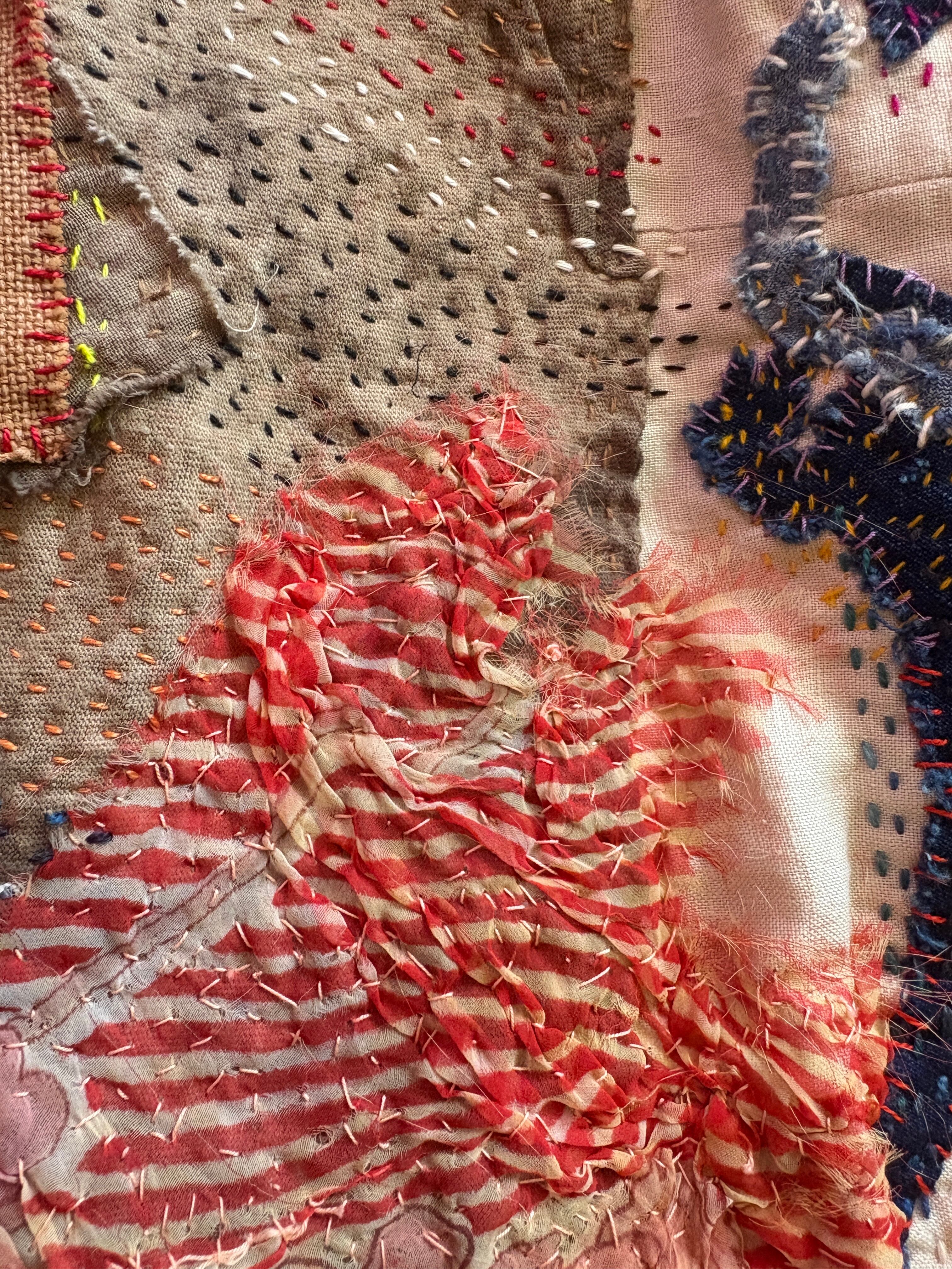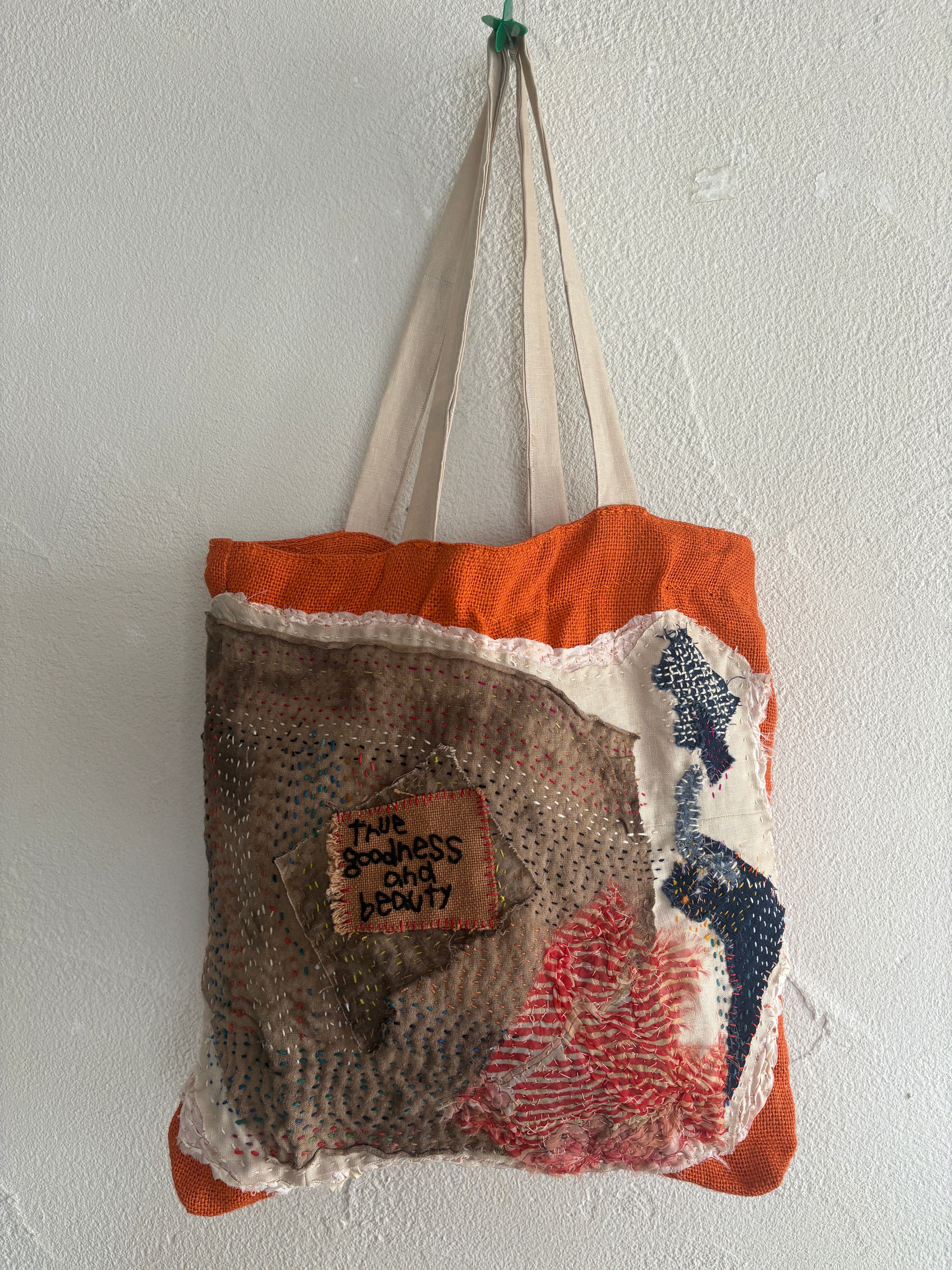 オレンジベースに泥染したハギレ,インドの古布を縫い付け,言葉の刺繍をしました。