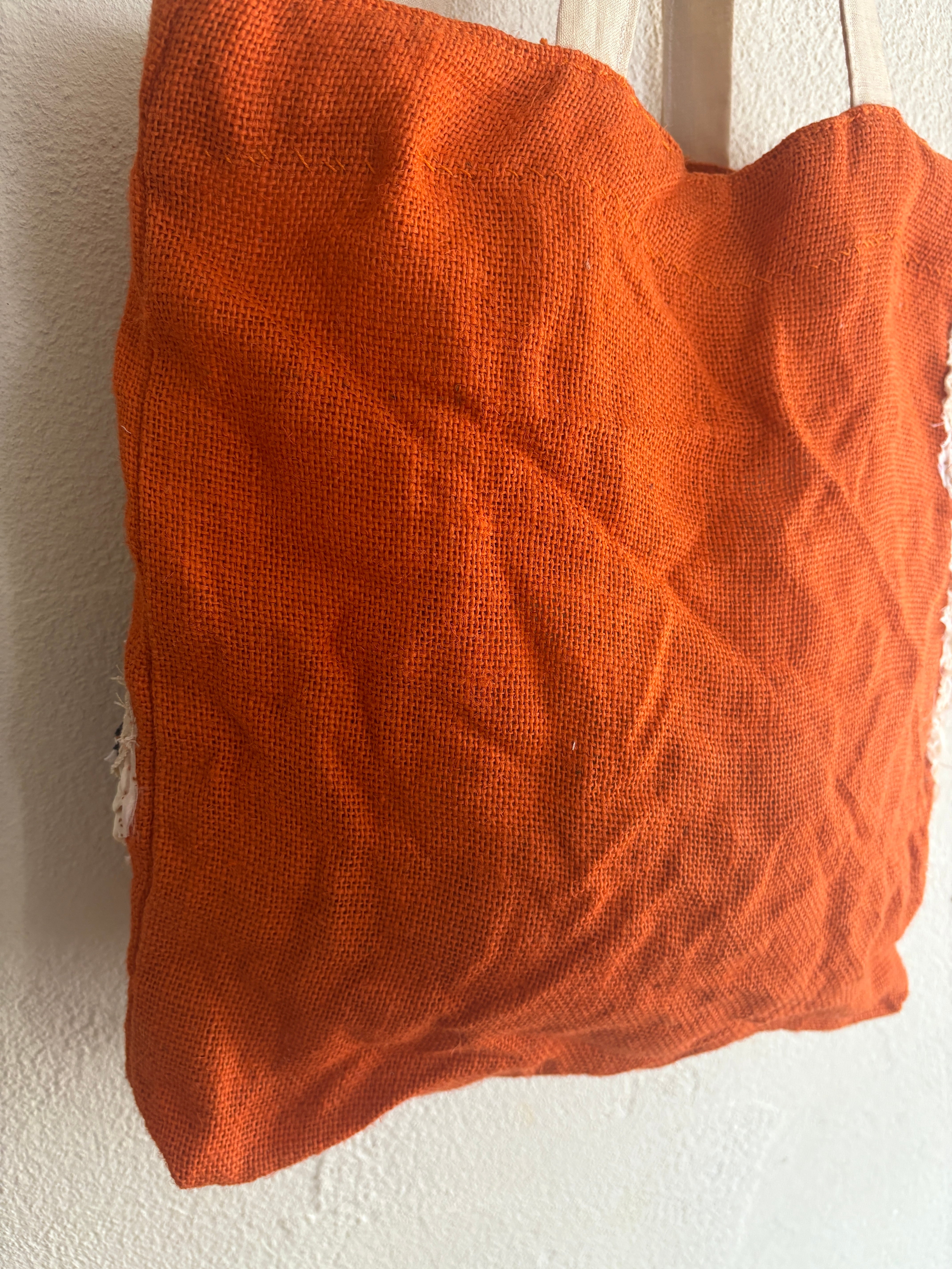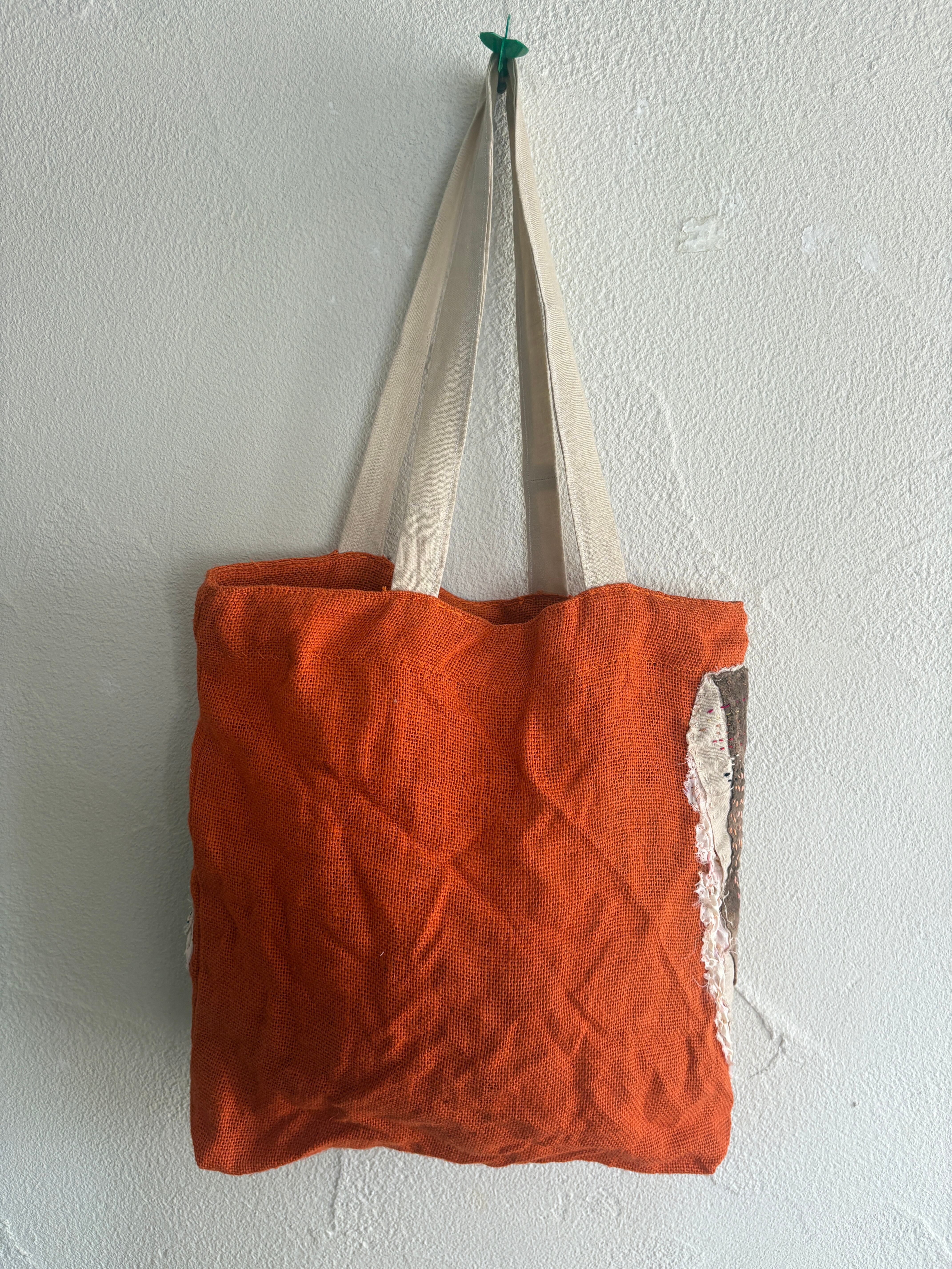 目の荒いオレンジの麻のbagにステッチをしたハギレを装飾したbagになります。