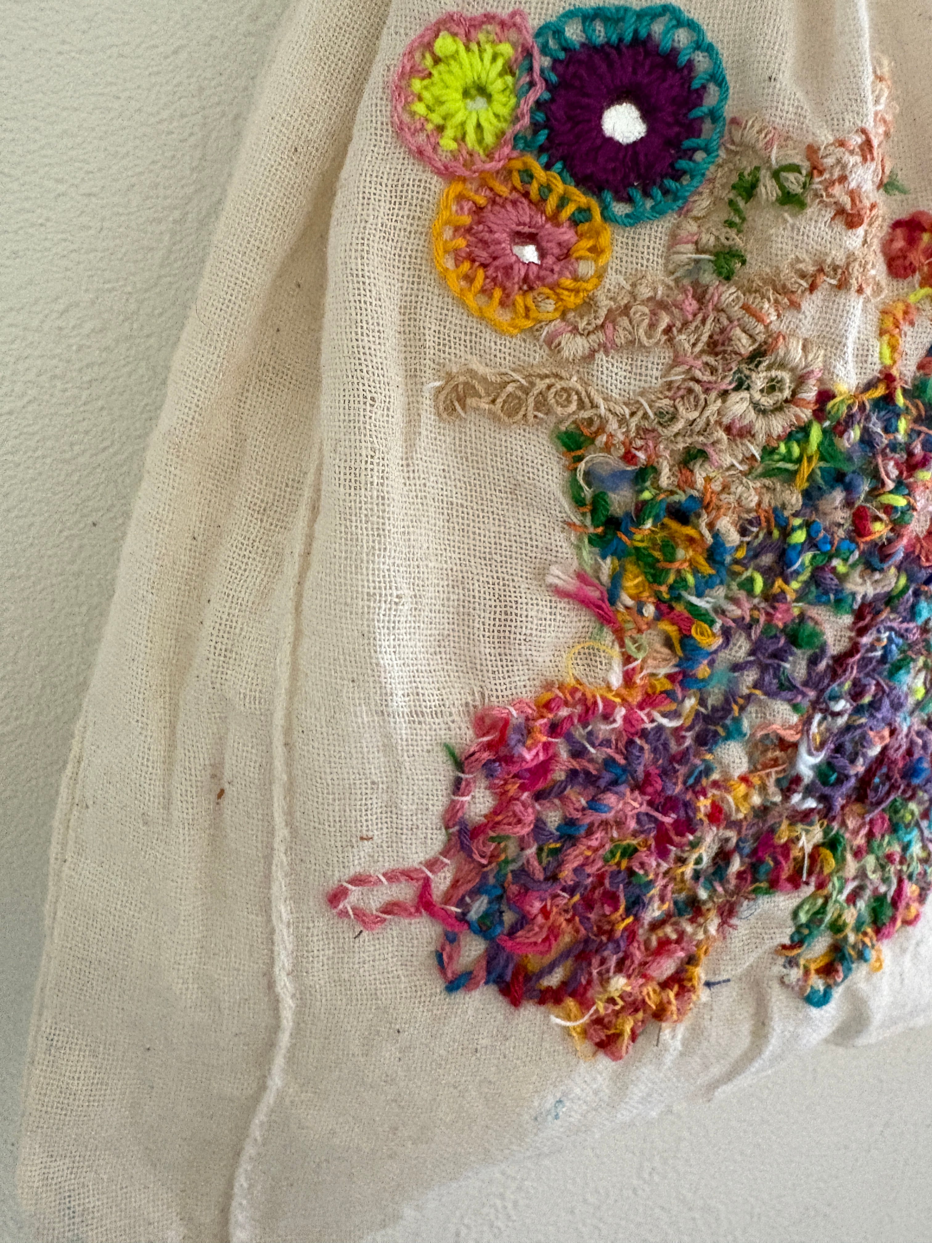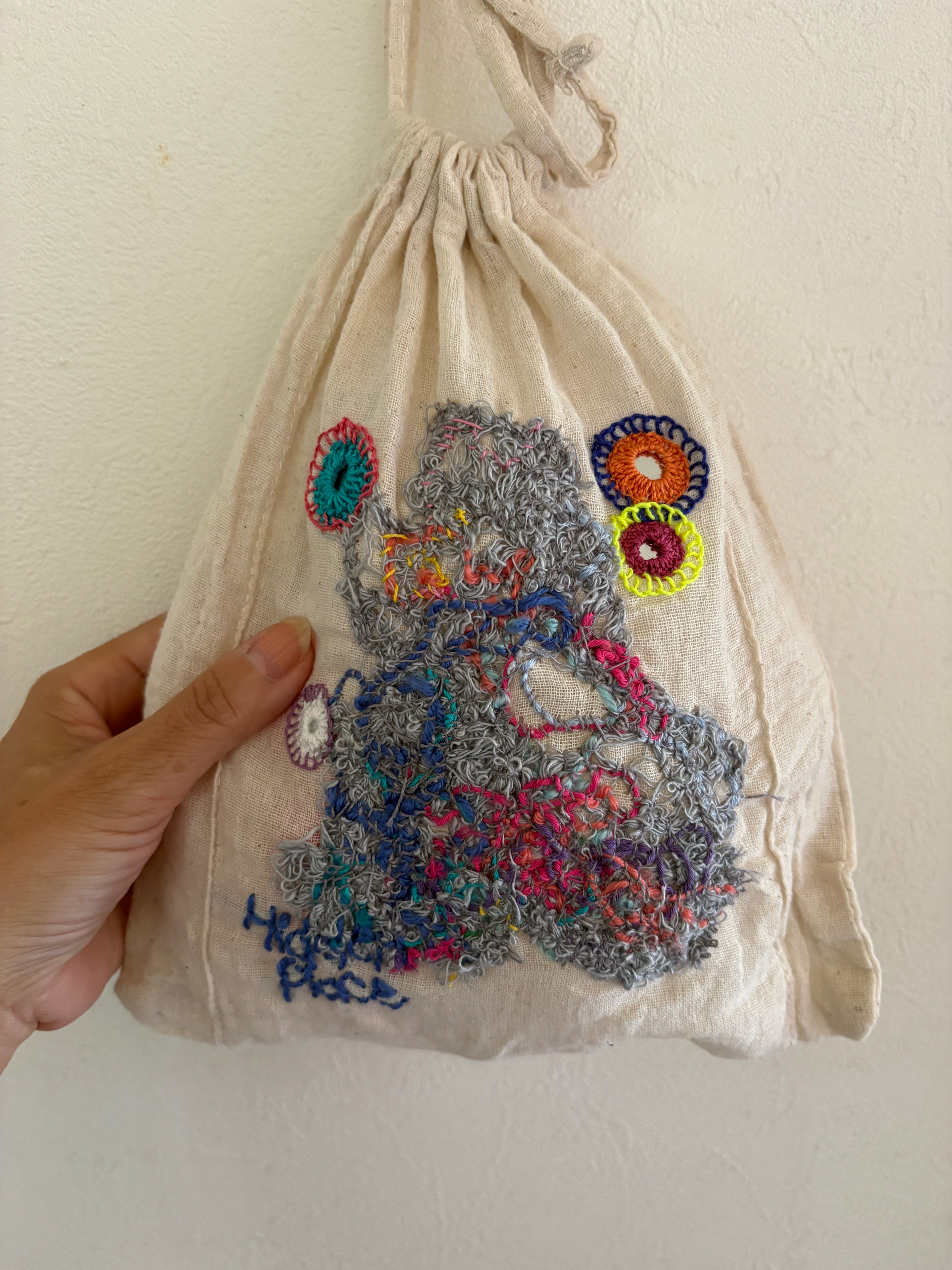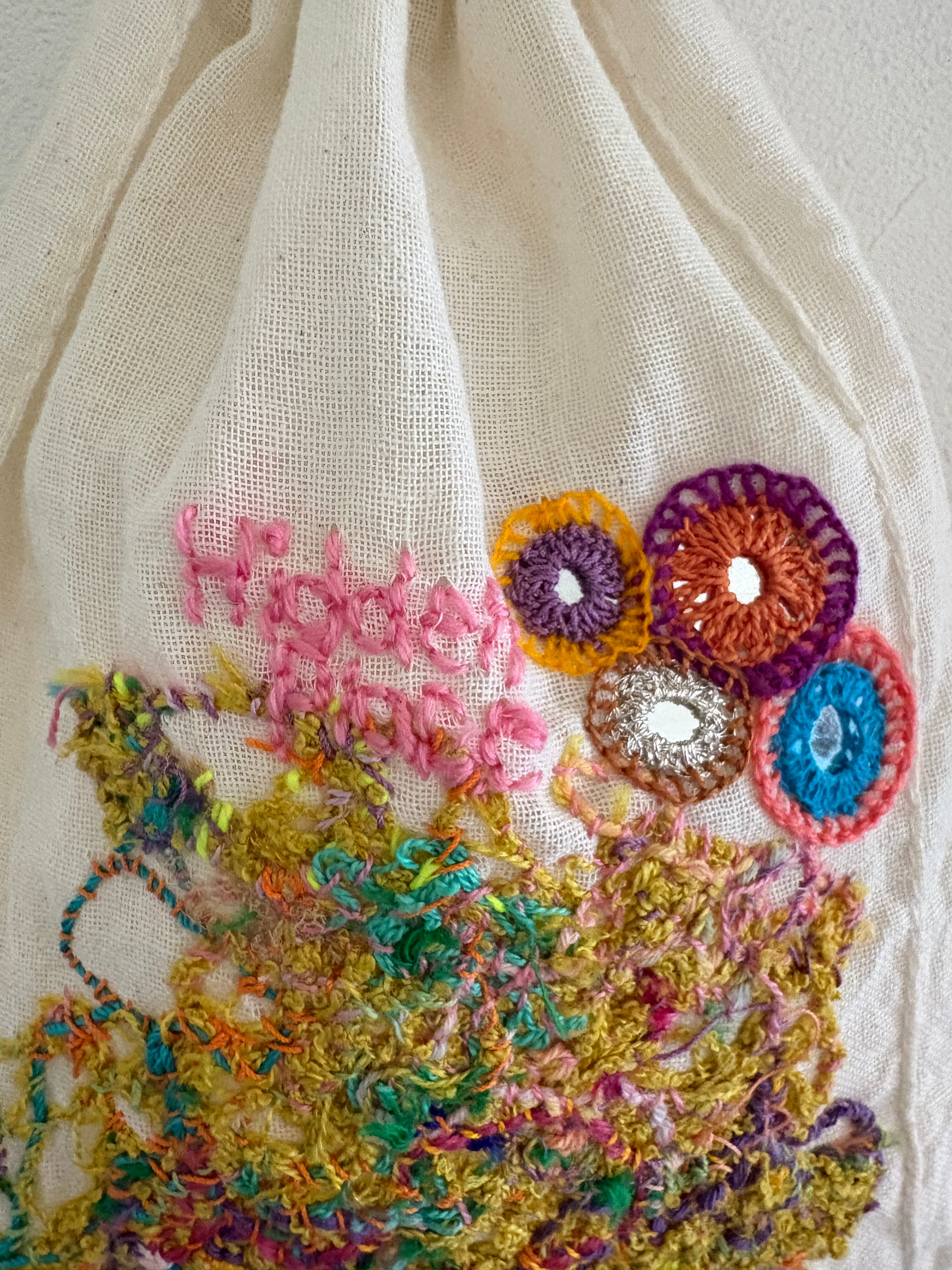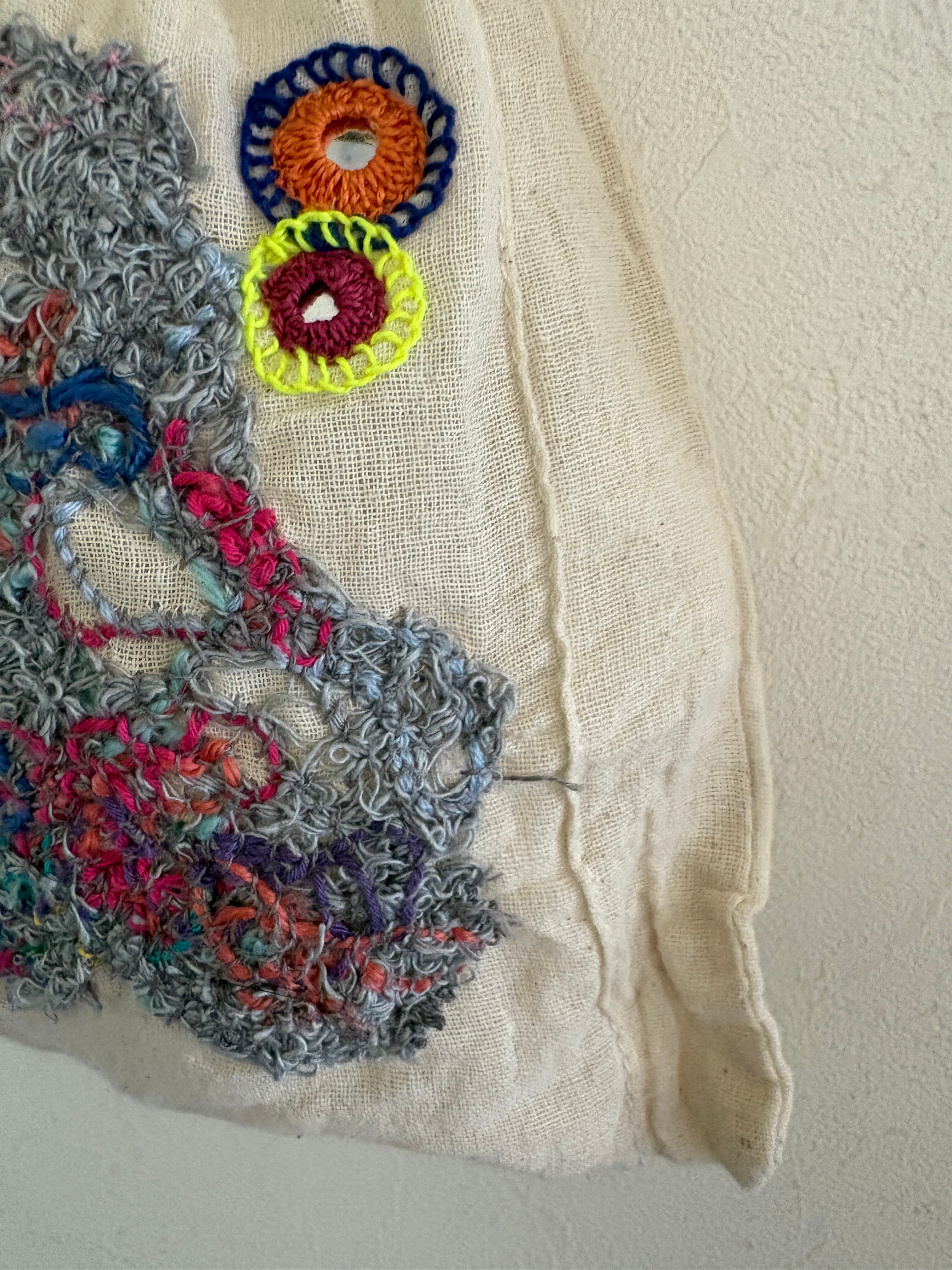 カラフルな糸くずを縫い付けてアクセントにはミラーワークを。