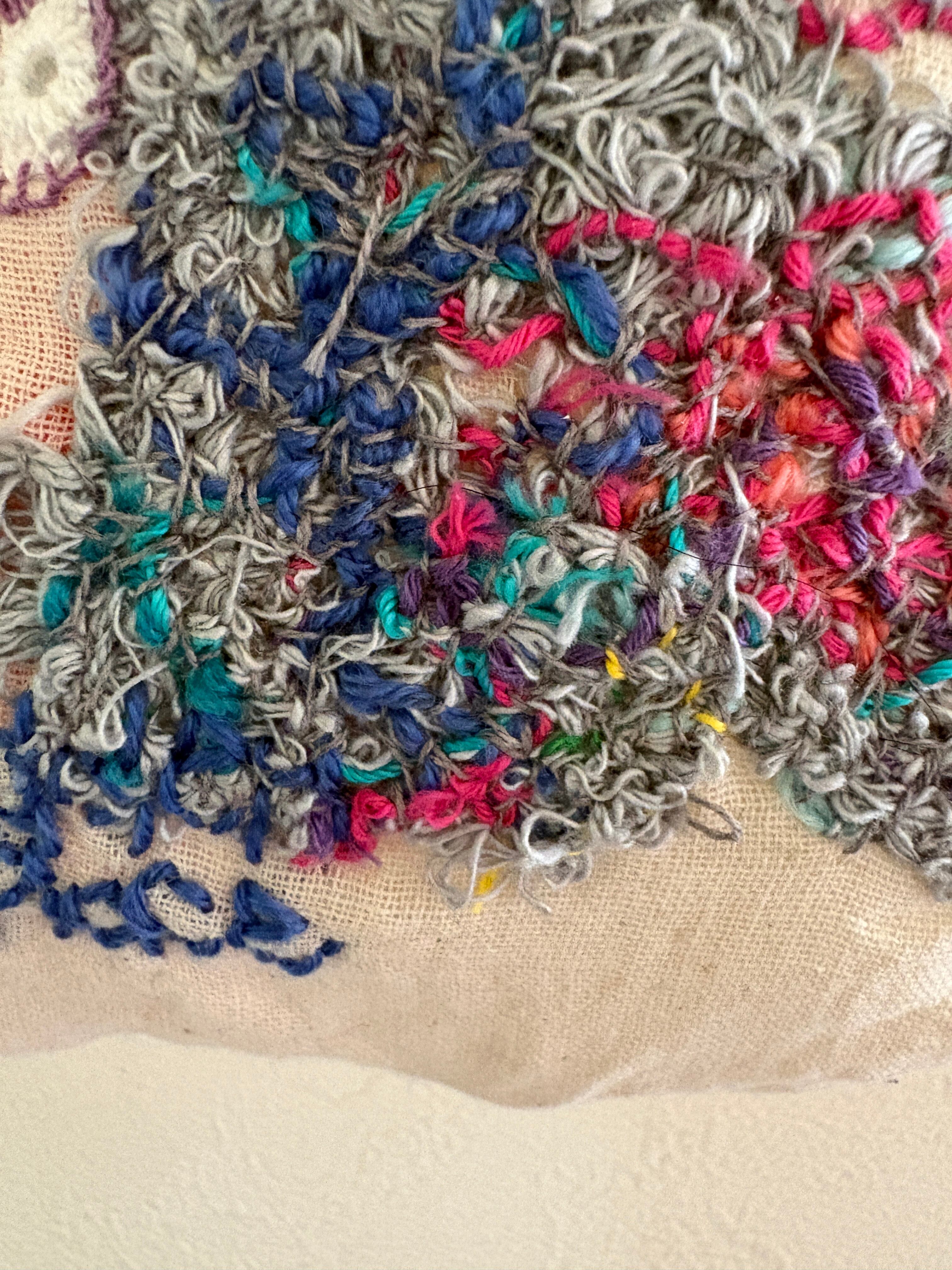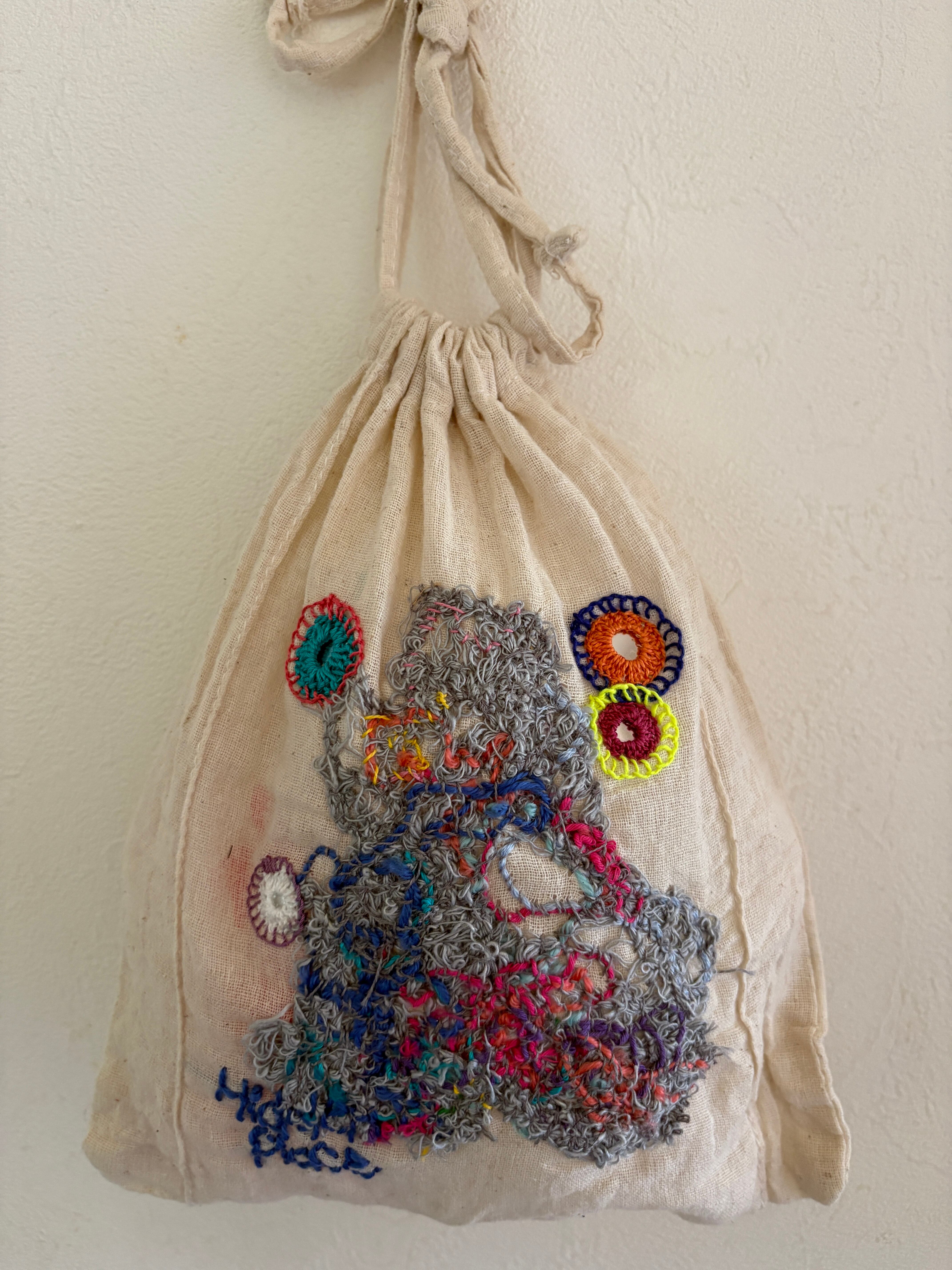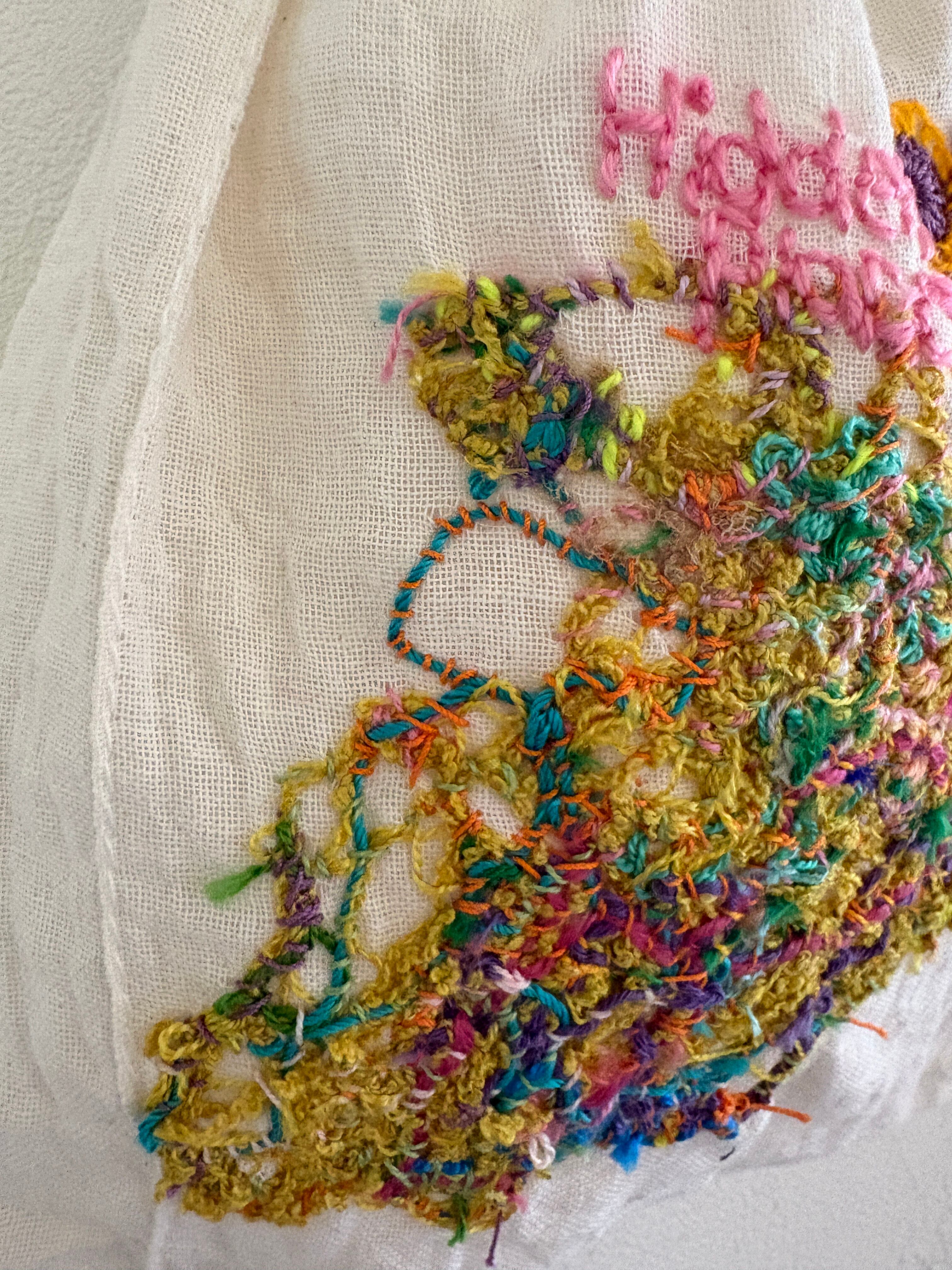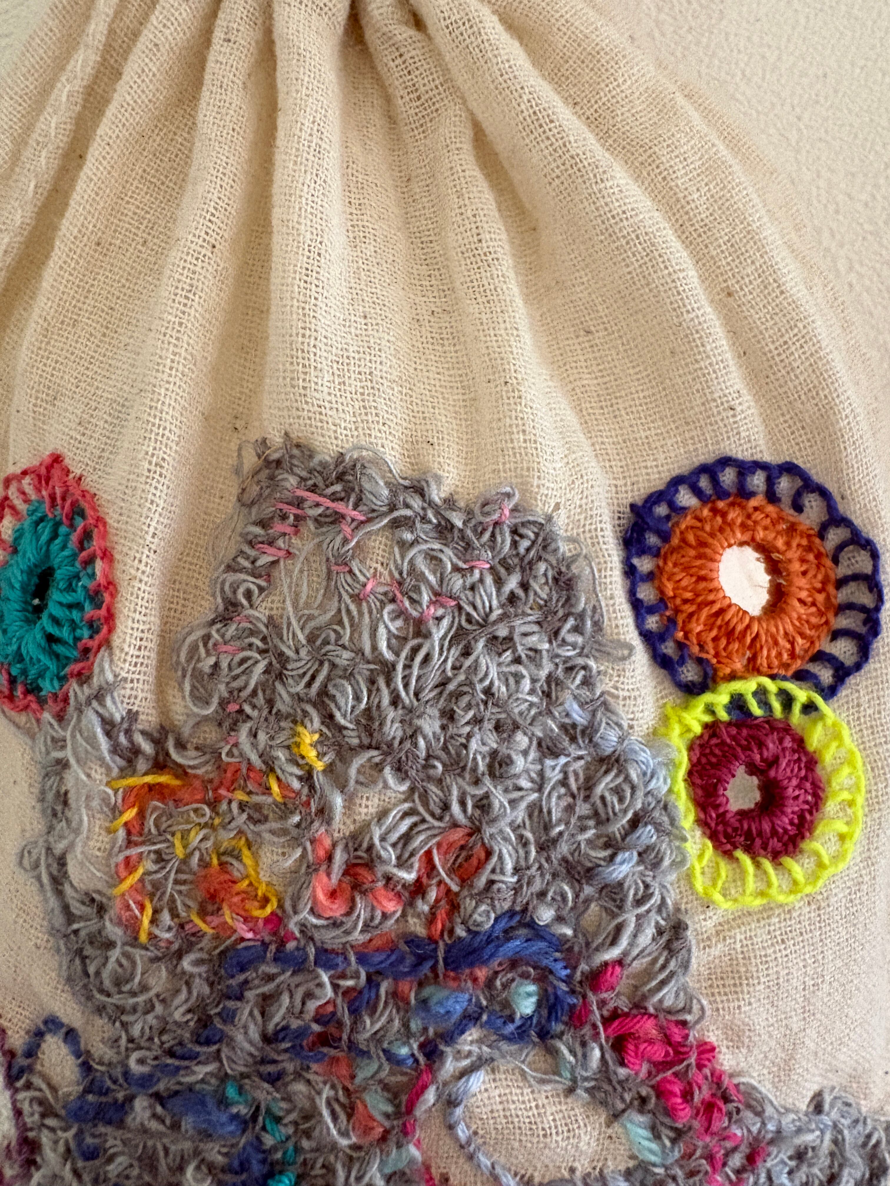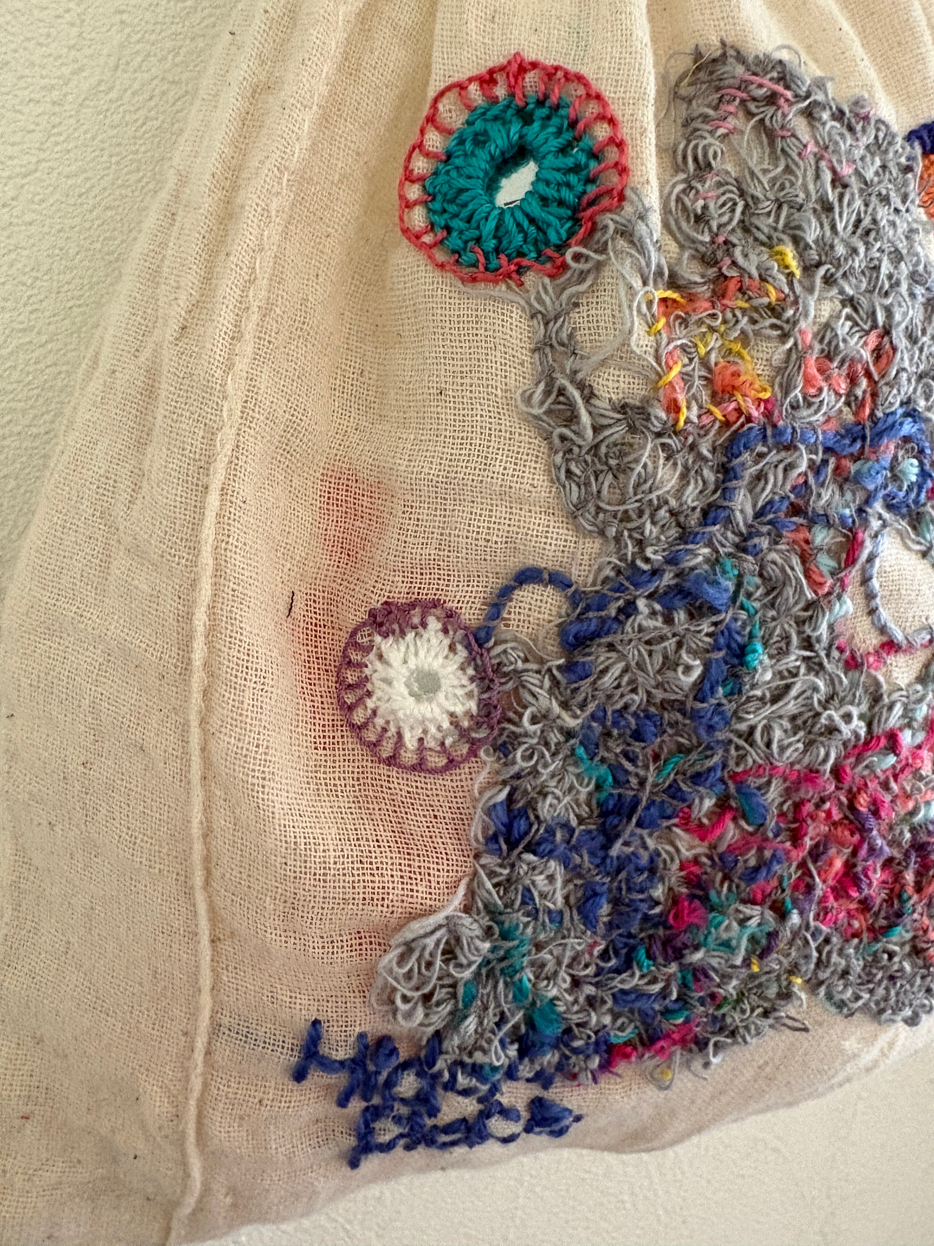 カラフルな糸くずを縫い付けてアクセントにはミラーワークを。