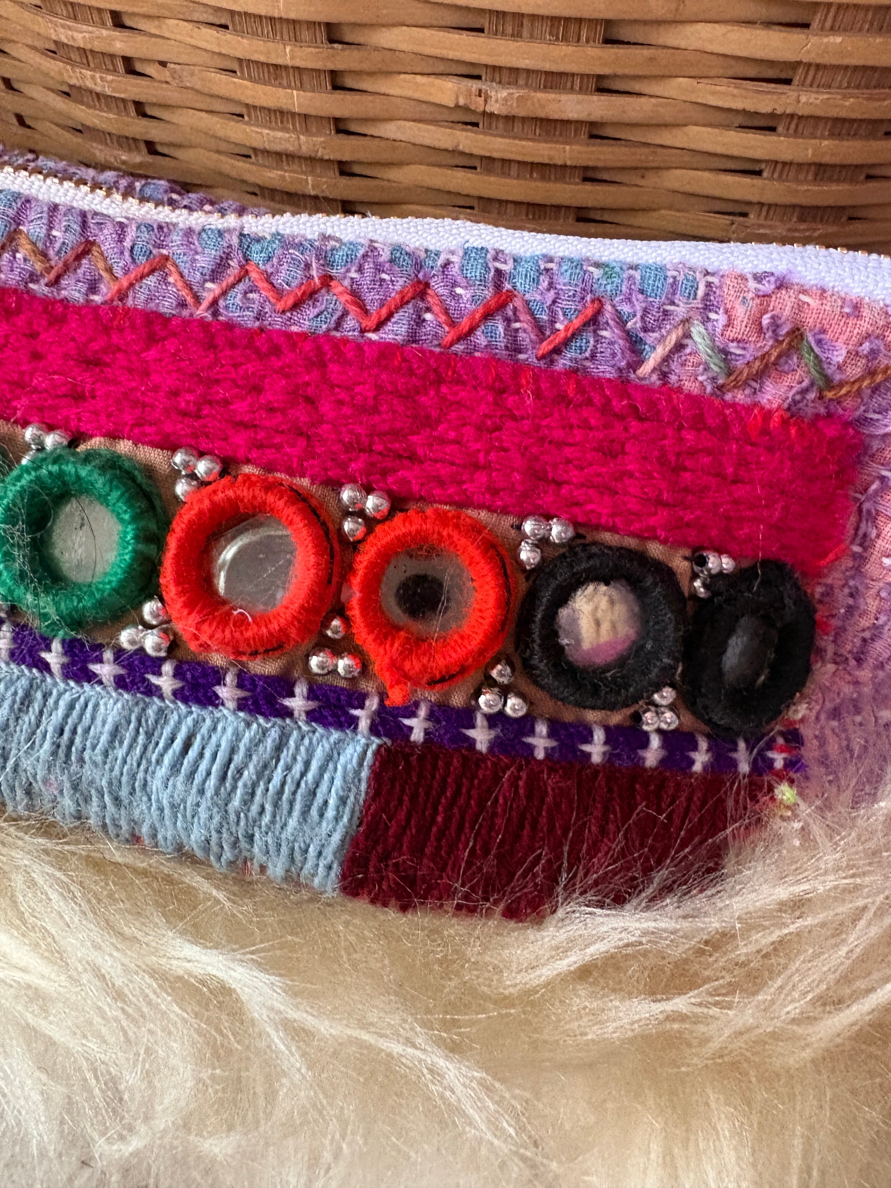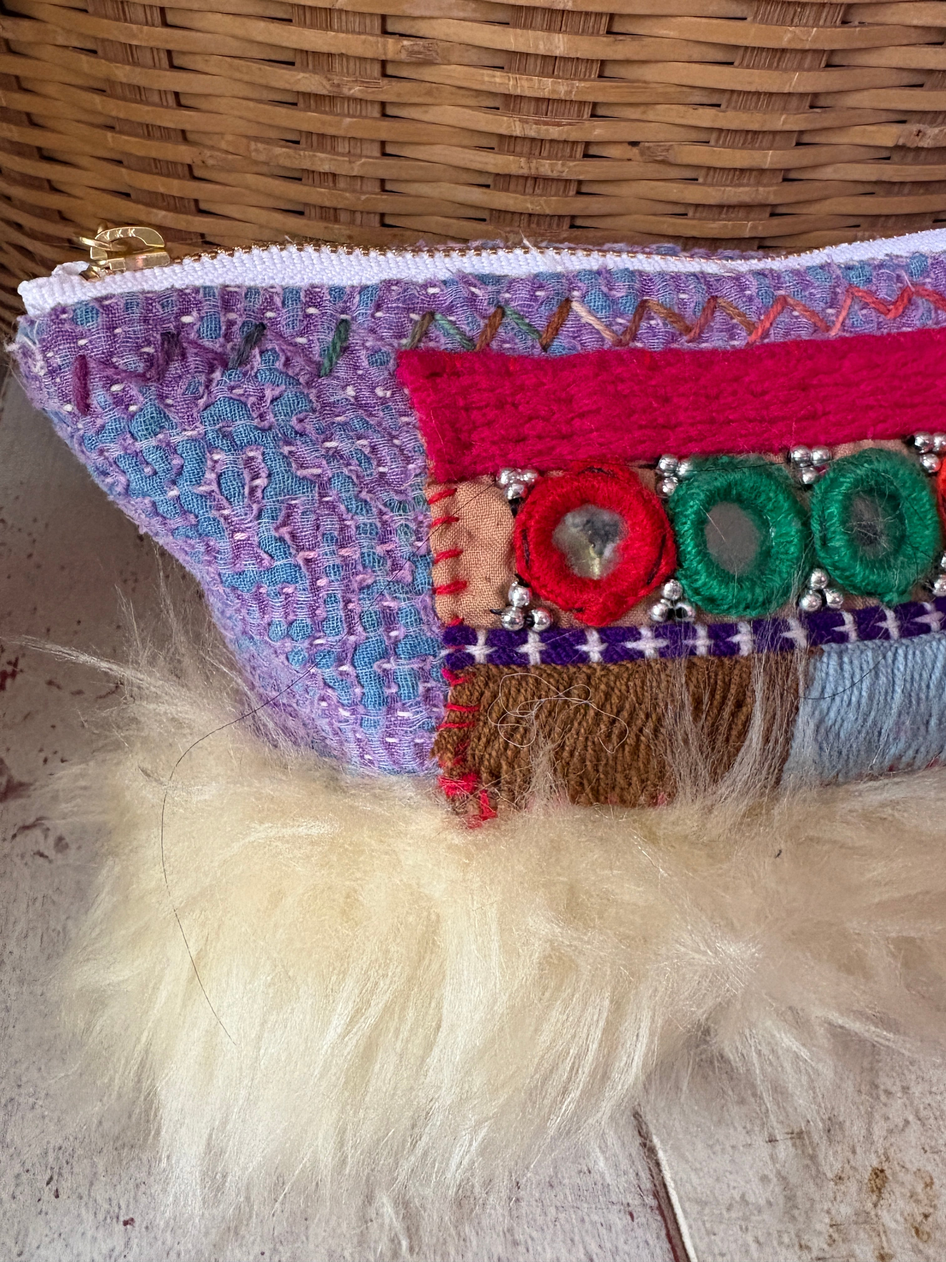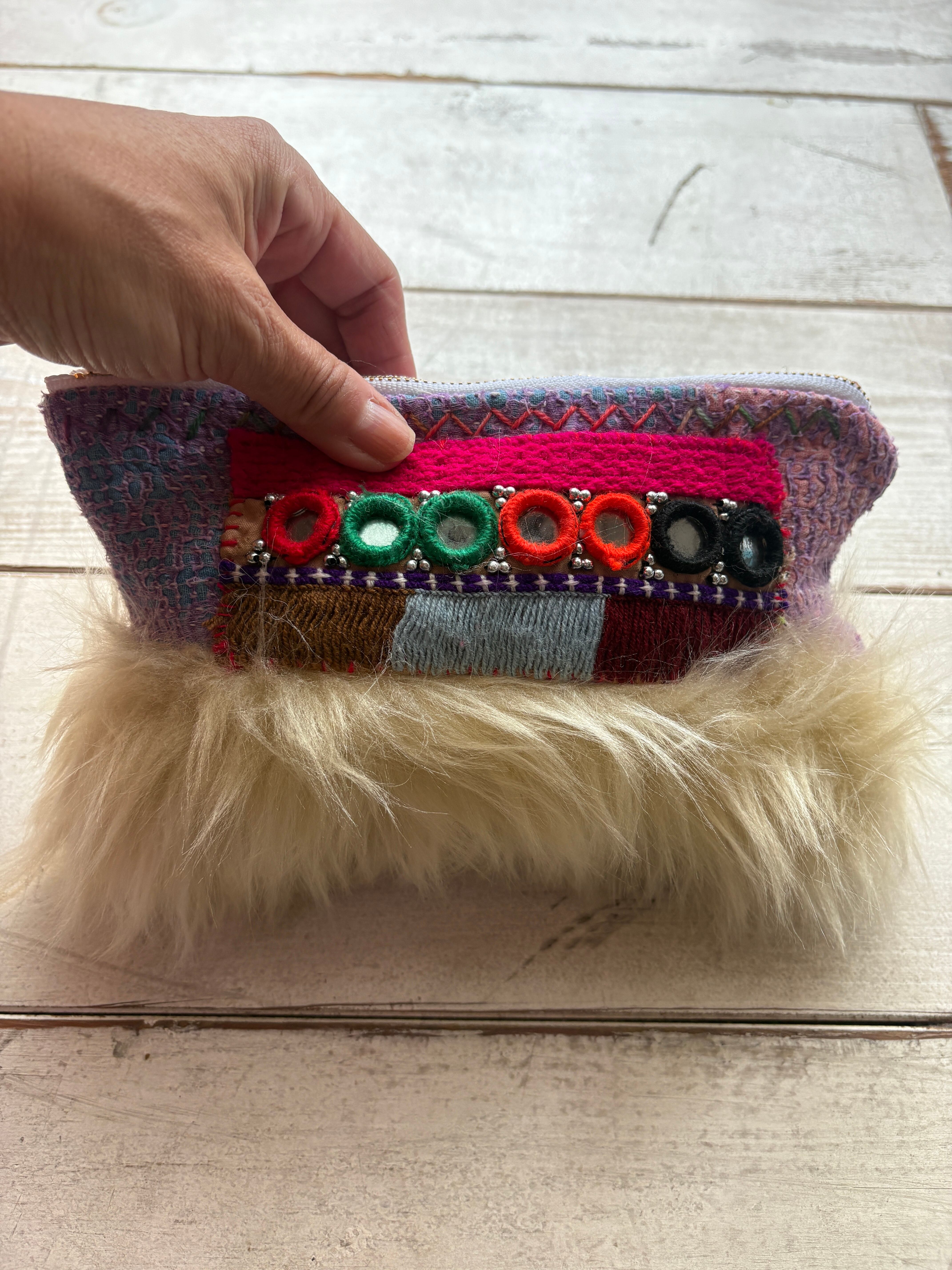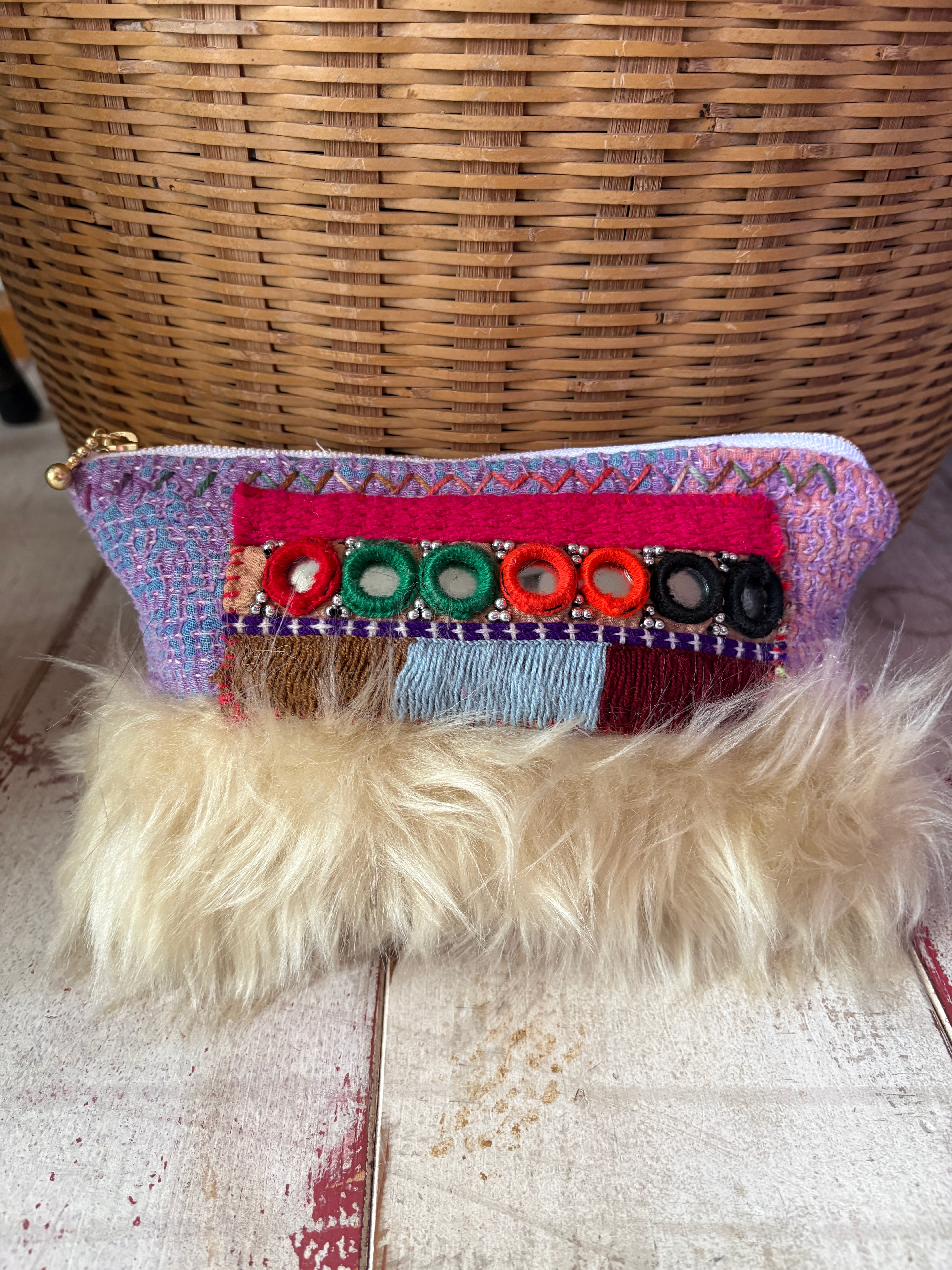 紫が綺麗なヴィンテージカンタにファーを付けたポーチになります。