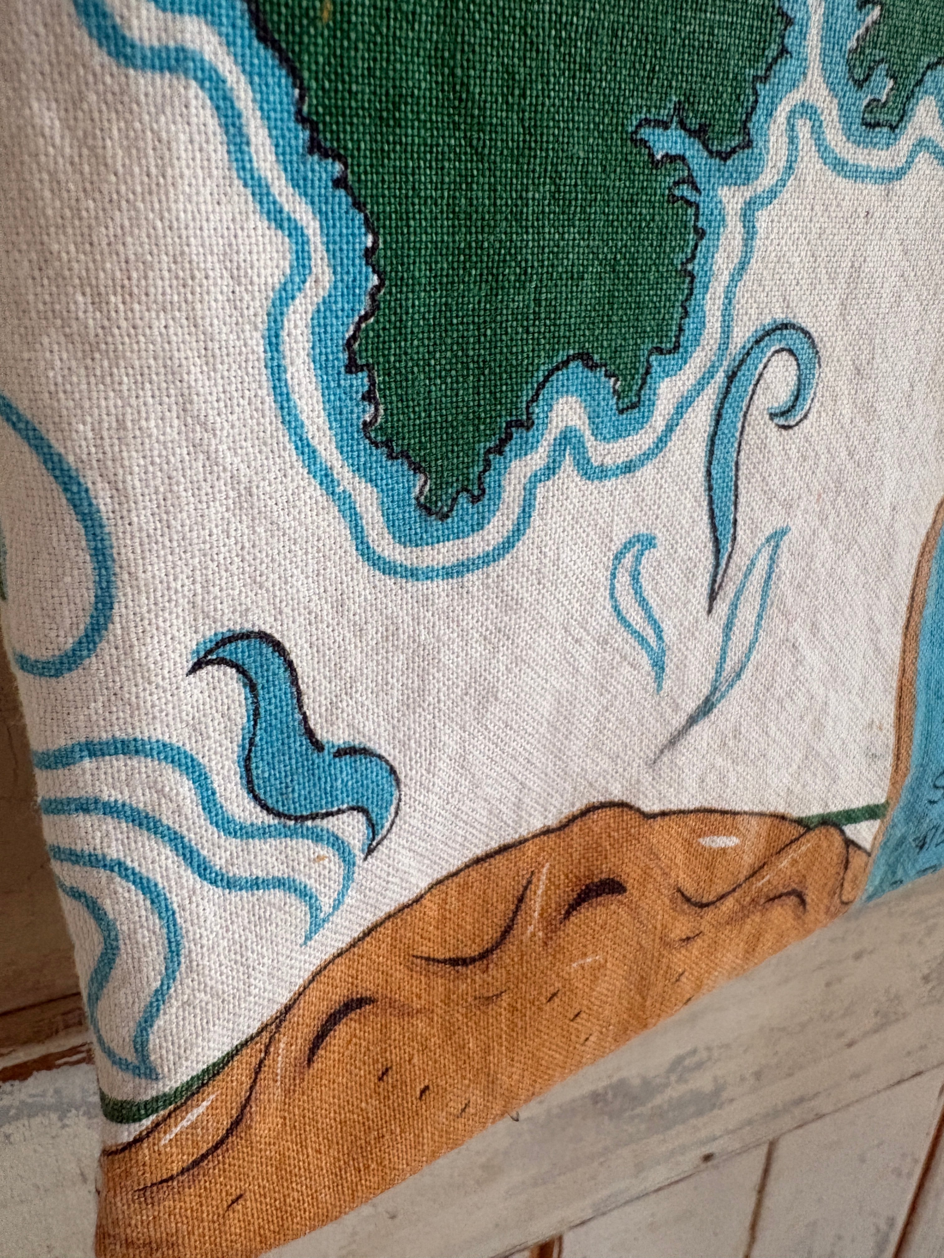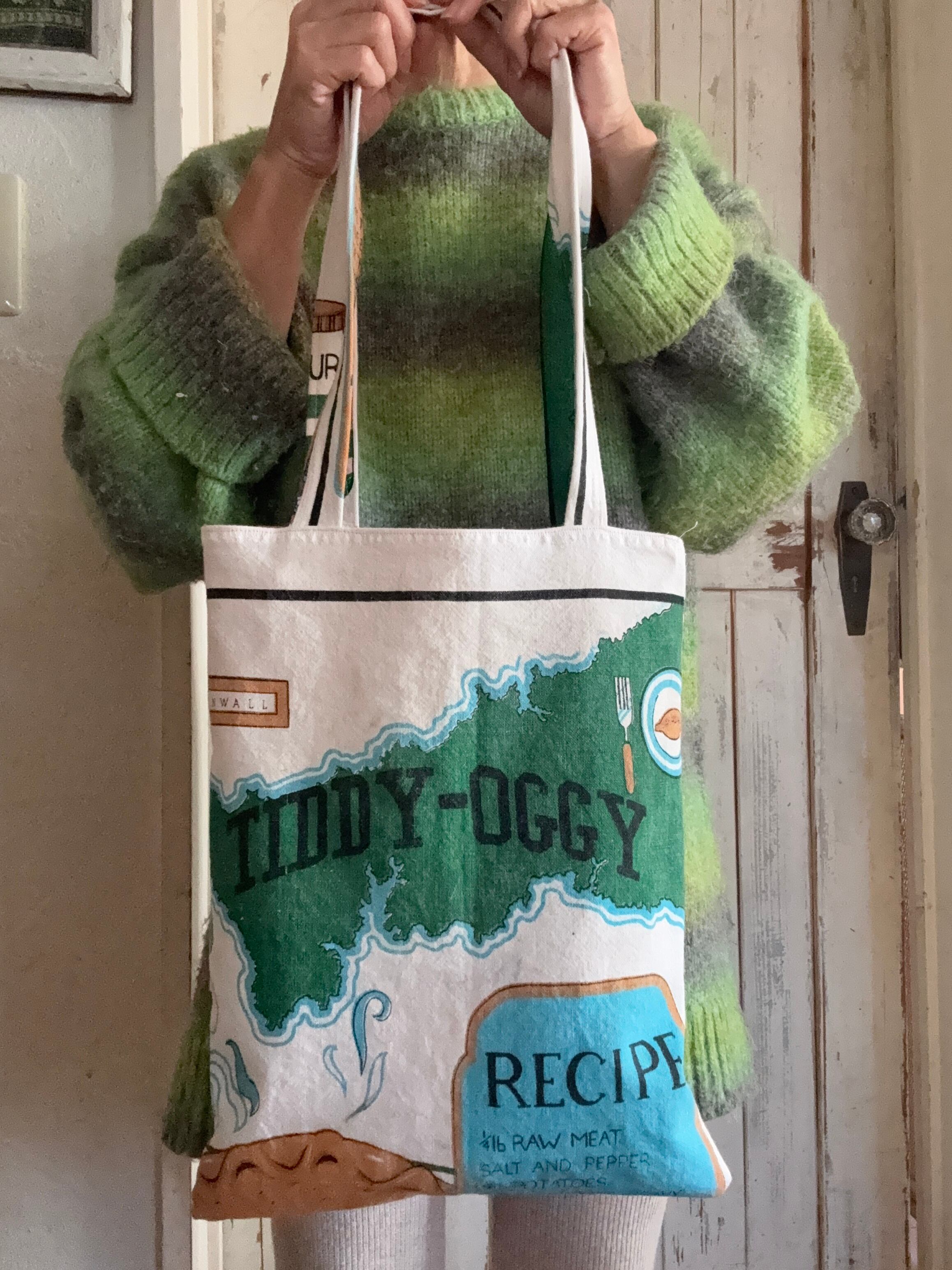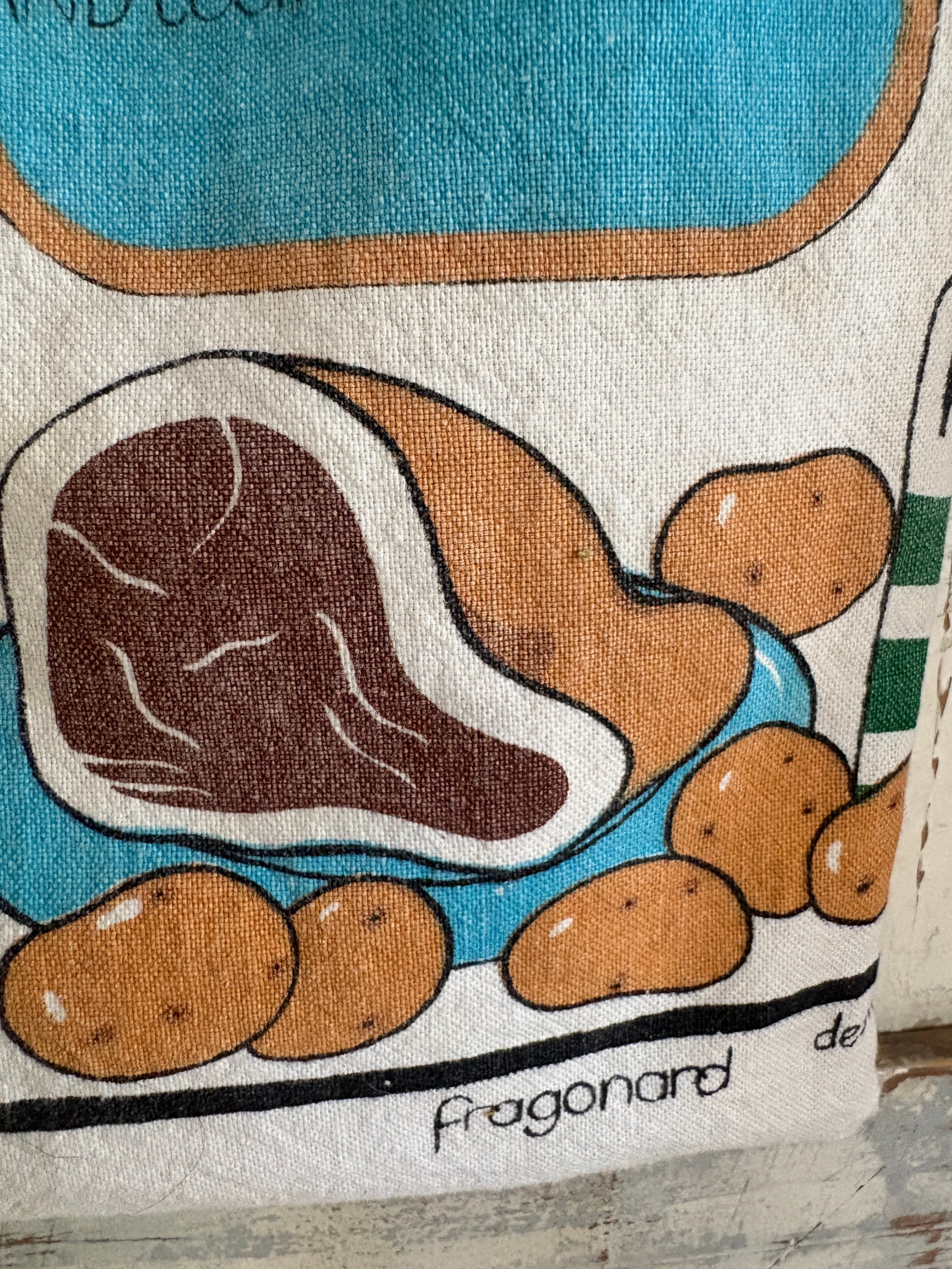 可愛らしい食べ物と男の人の表情が可愛いキッチンクロスをリメイクしたbag。