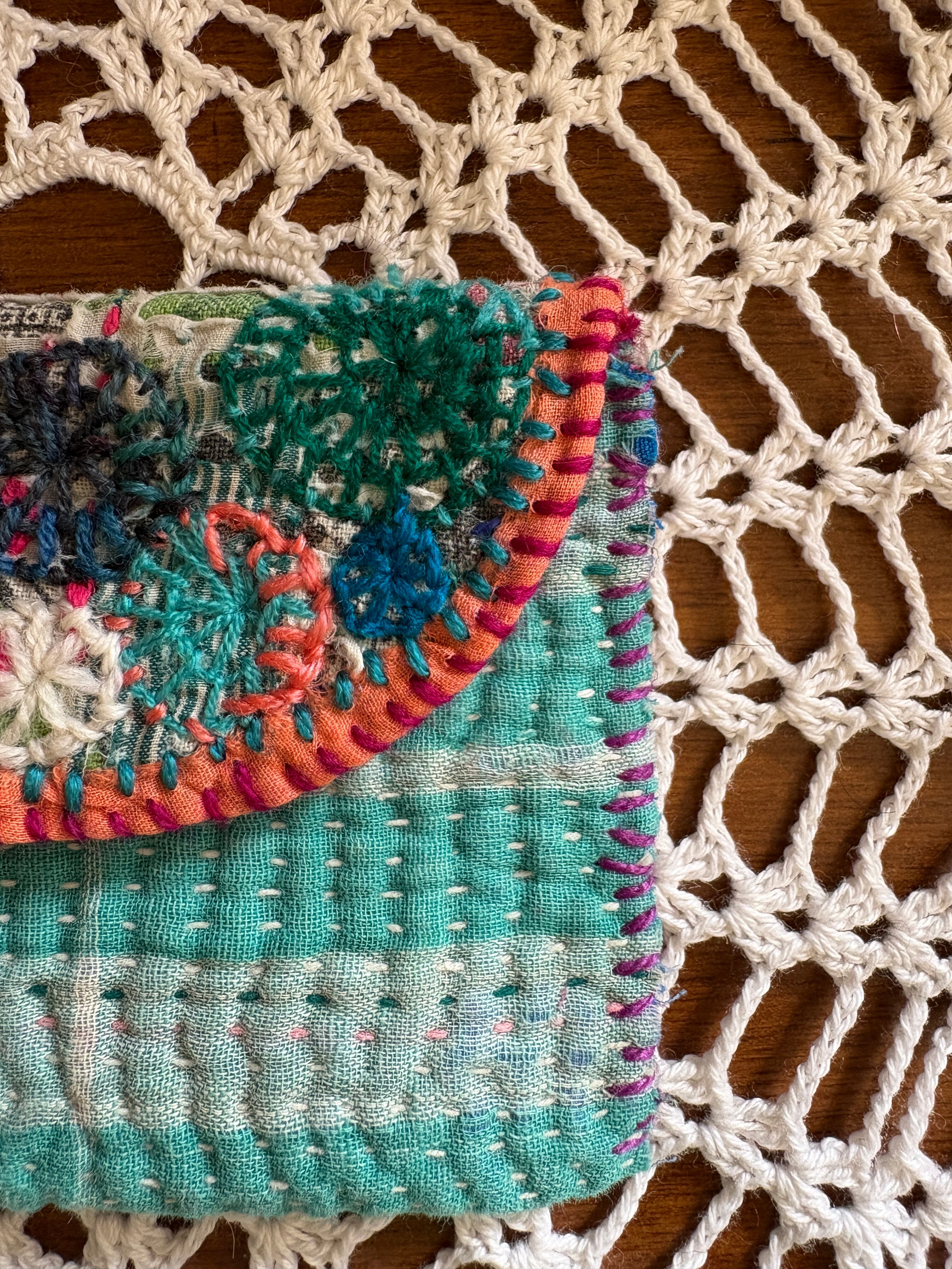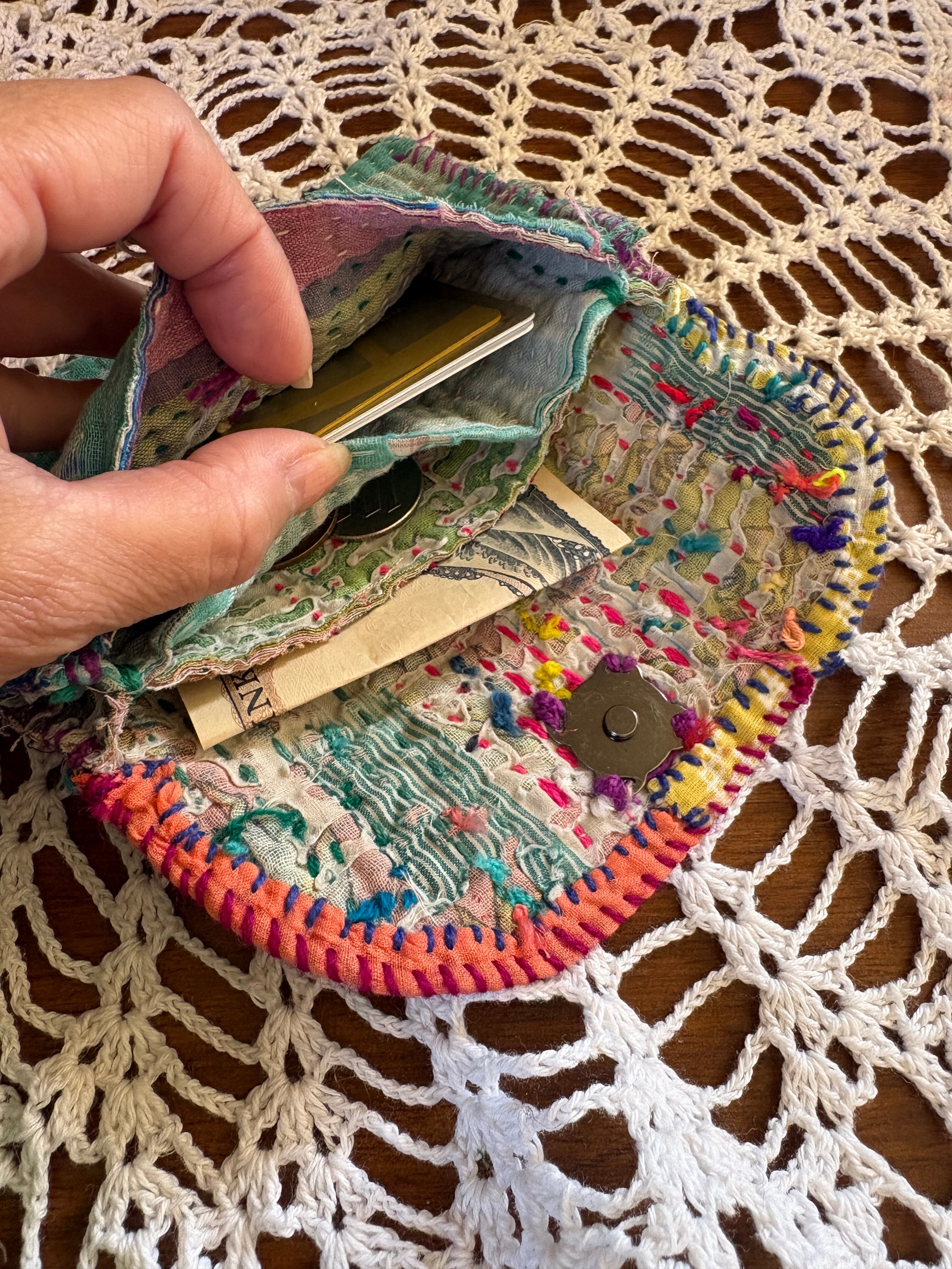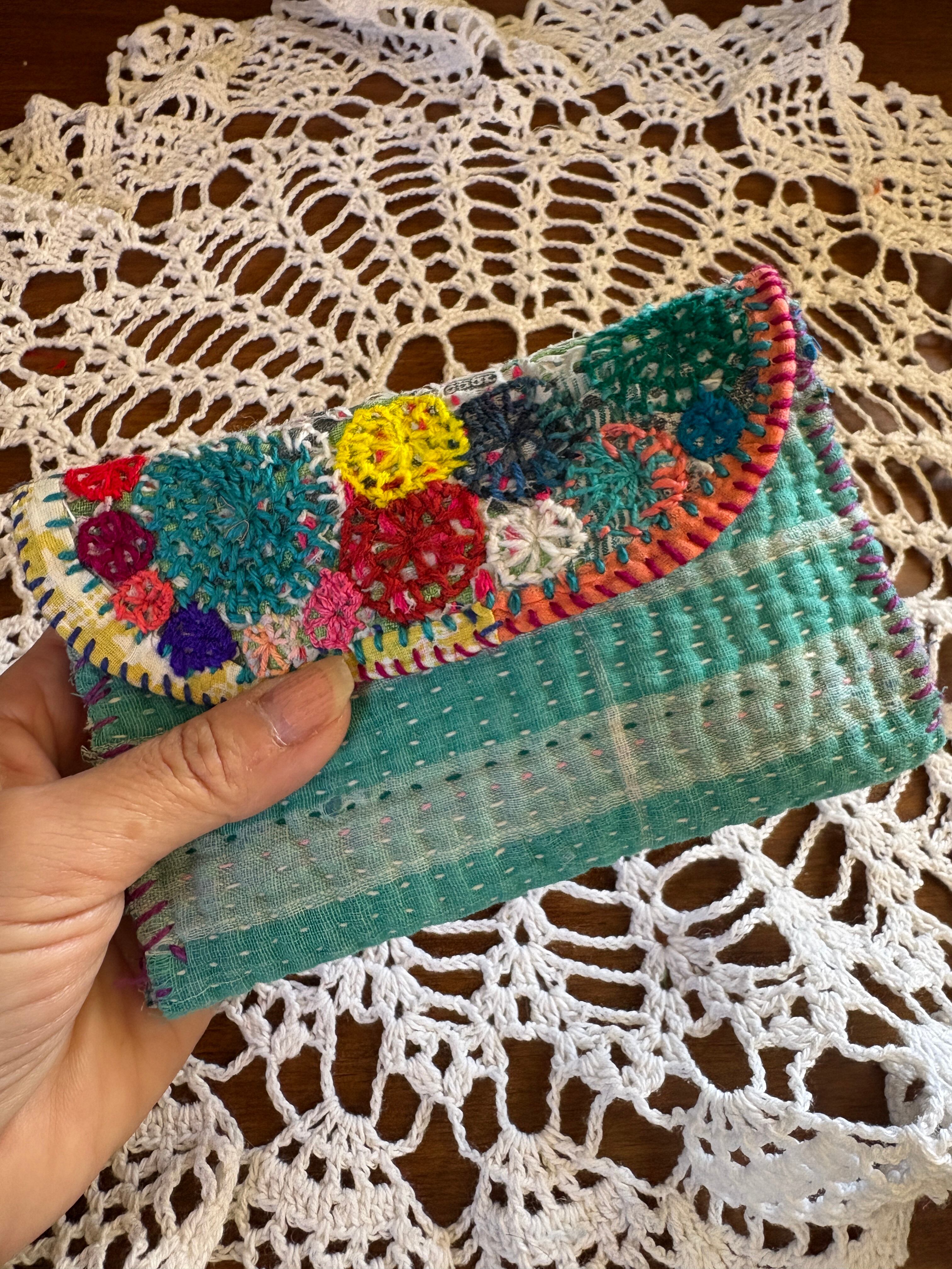 ビンテージカンタ生地を使用した小さなお財布。刺繍を施し、独特の風合いを出しました。お財布はカード入れ,お札入れ,真ん中には小銭入れあります。