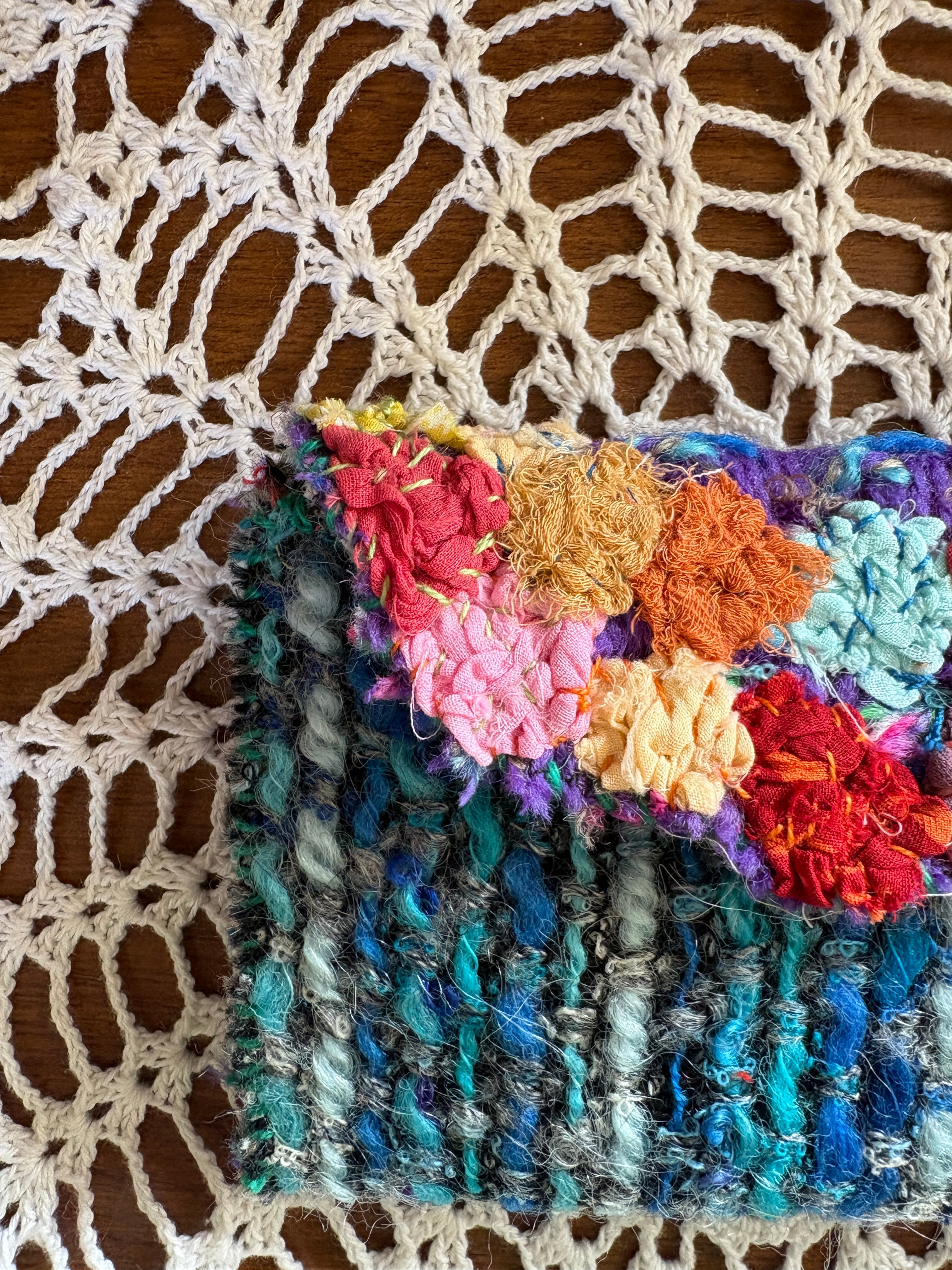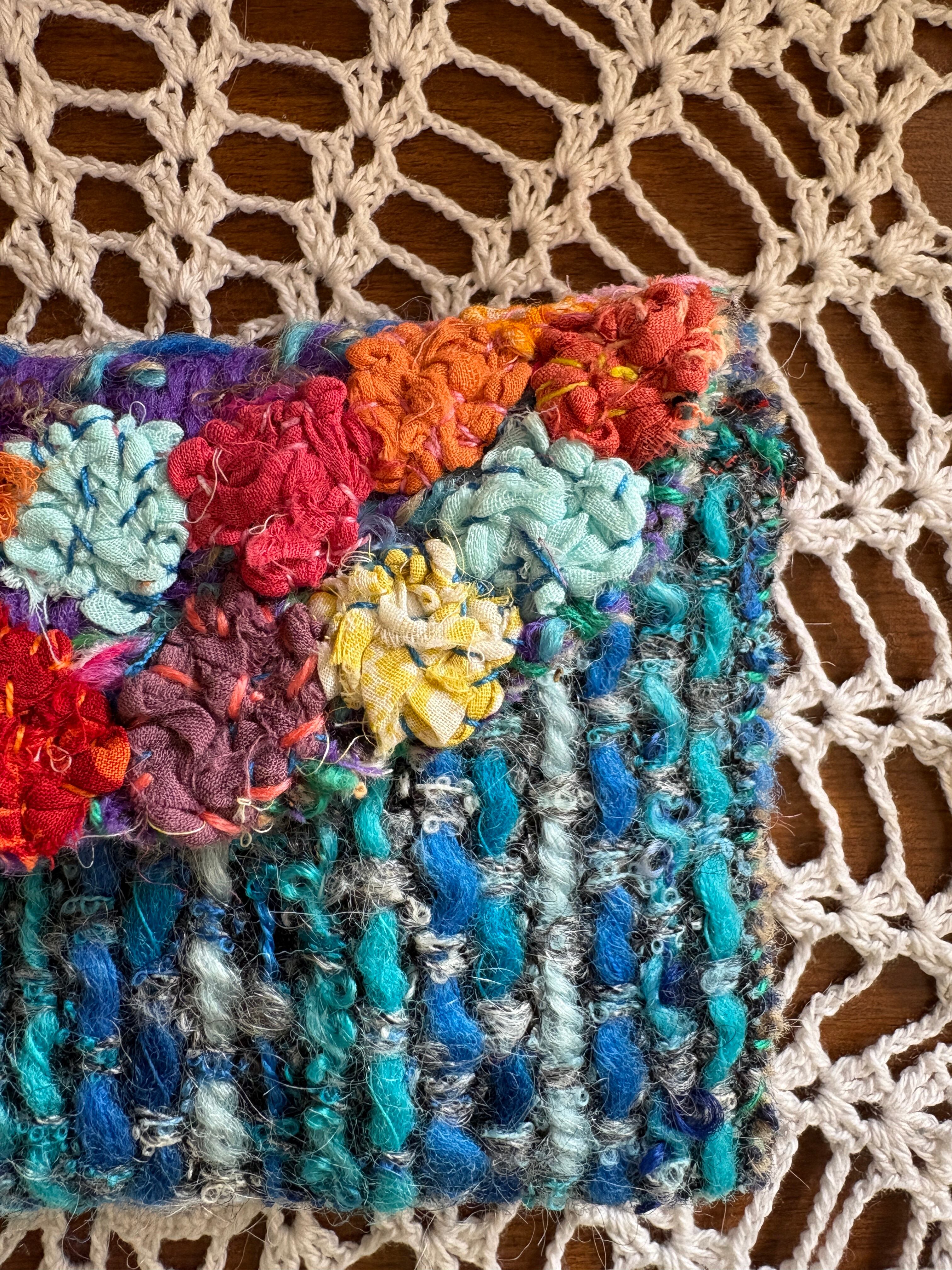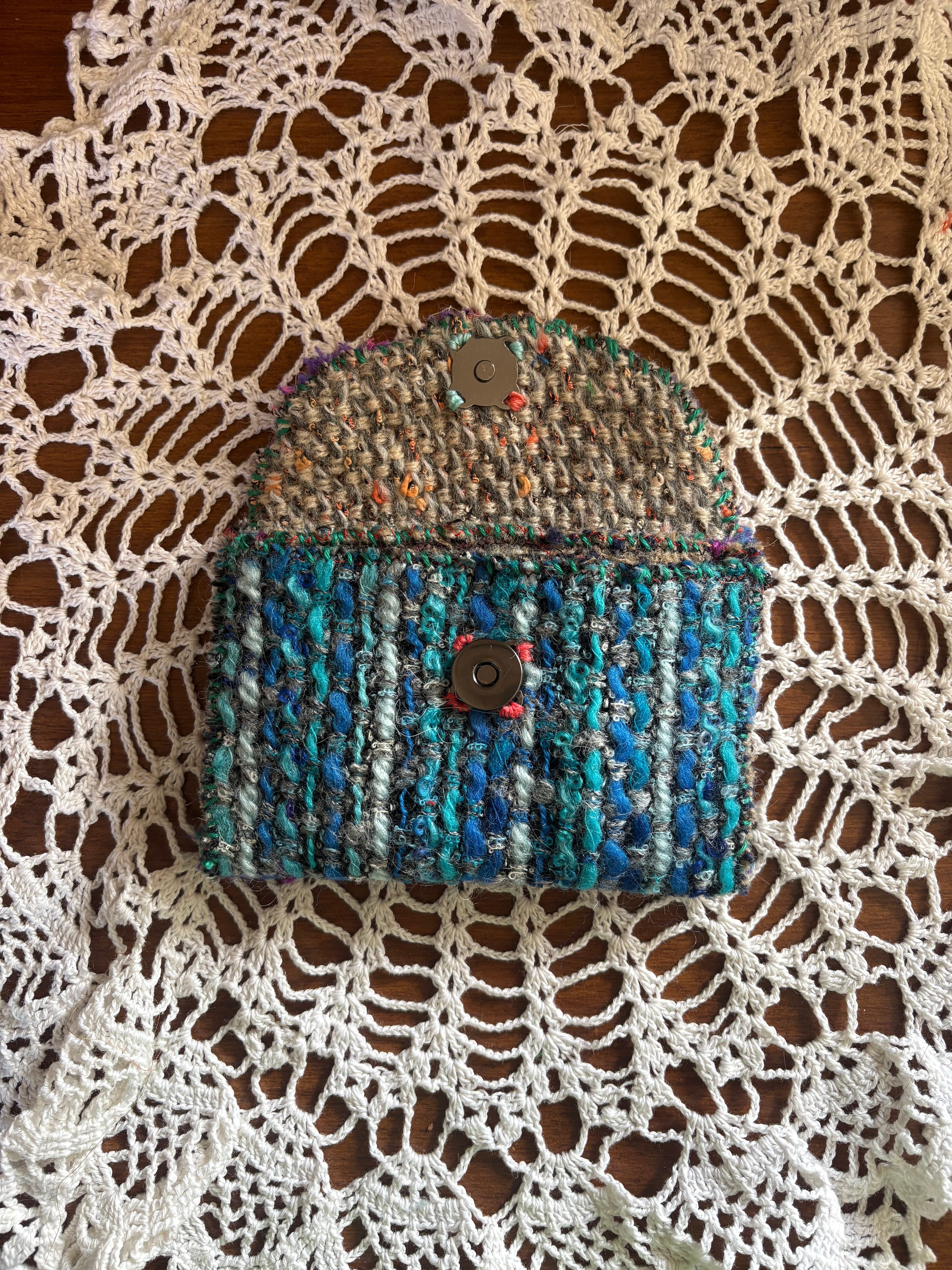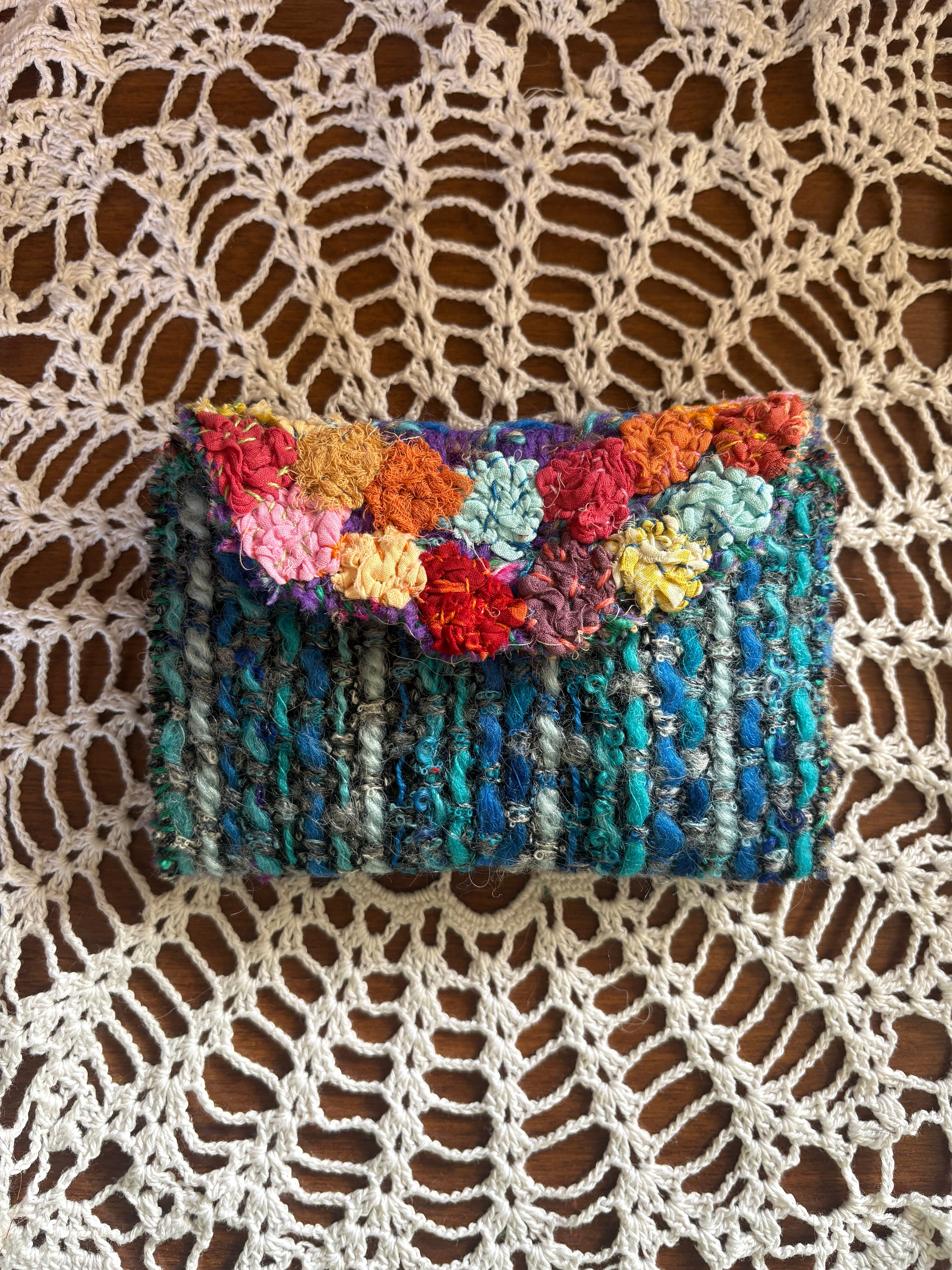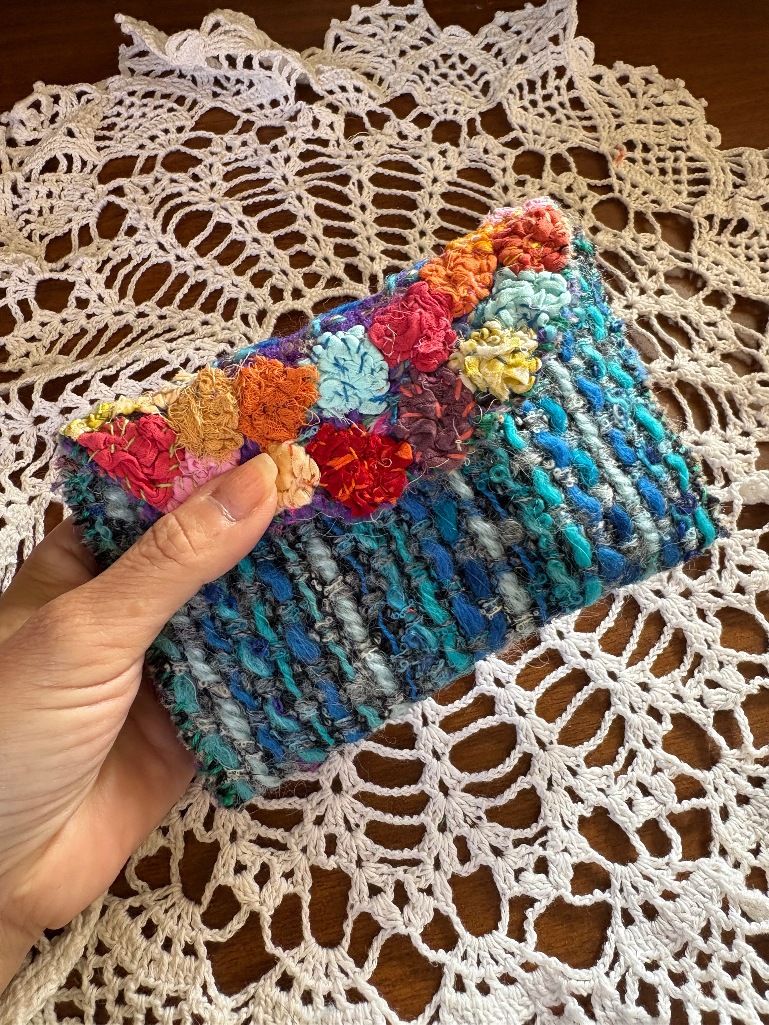レトロな古いニット生地を使用した小さなお財布。ハギレを縫い付け小さなお花を咲かせました。