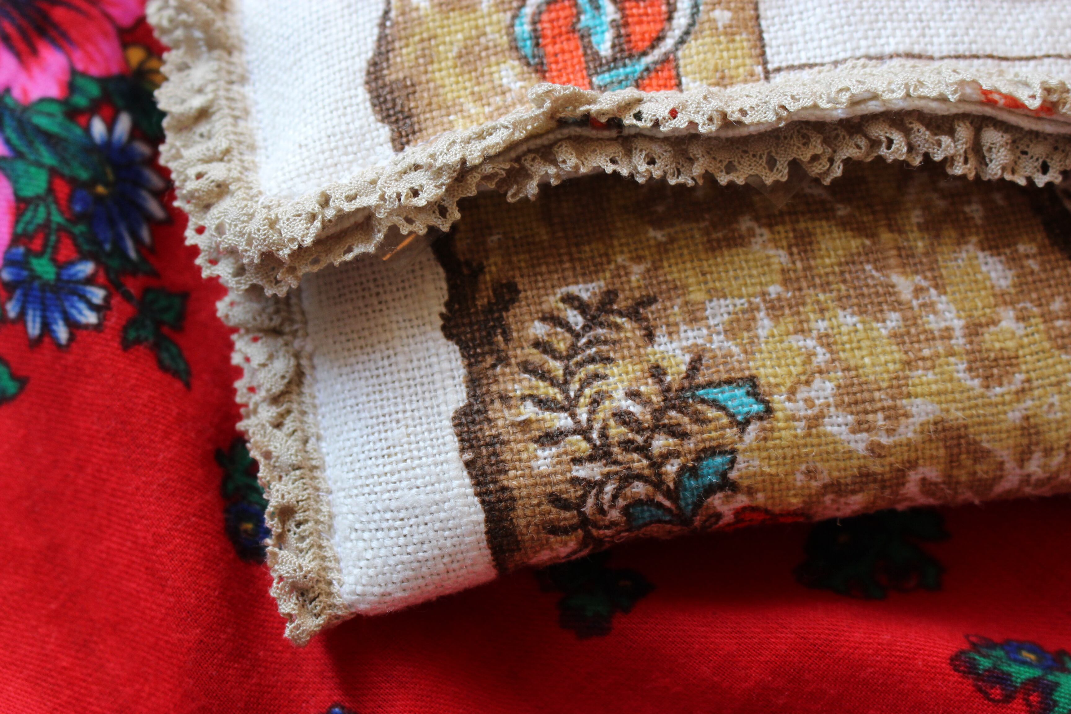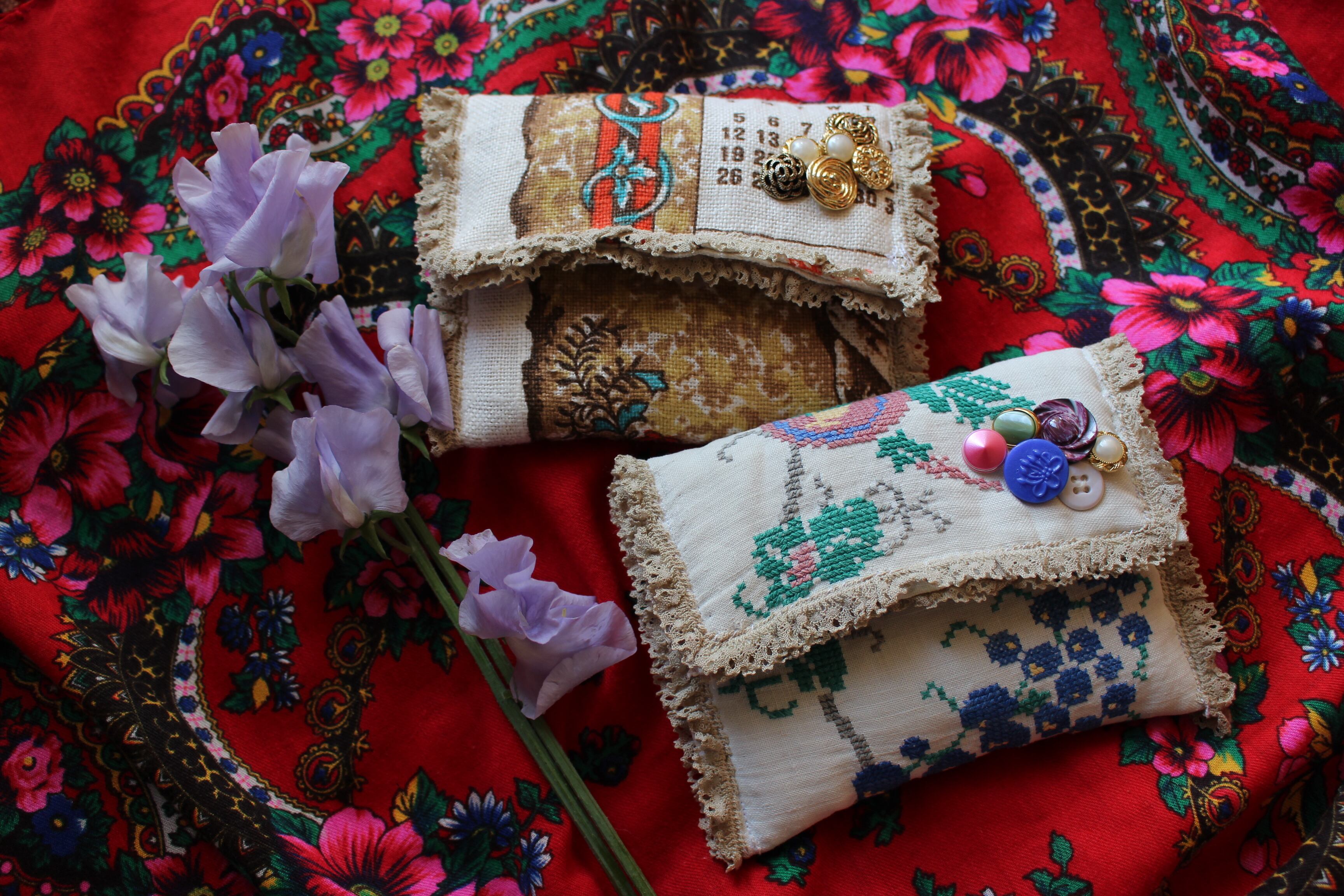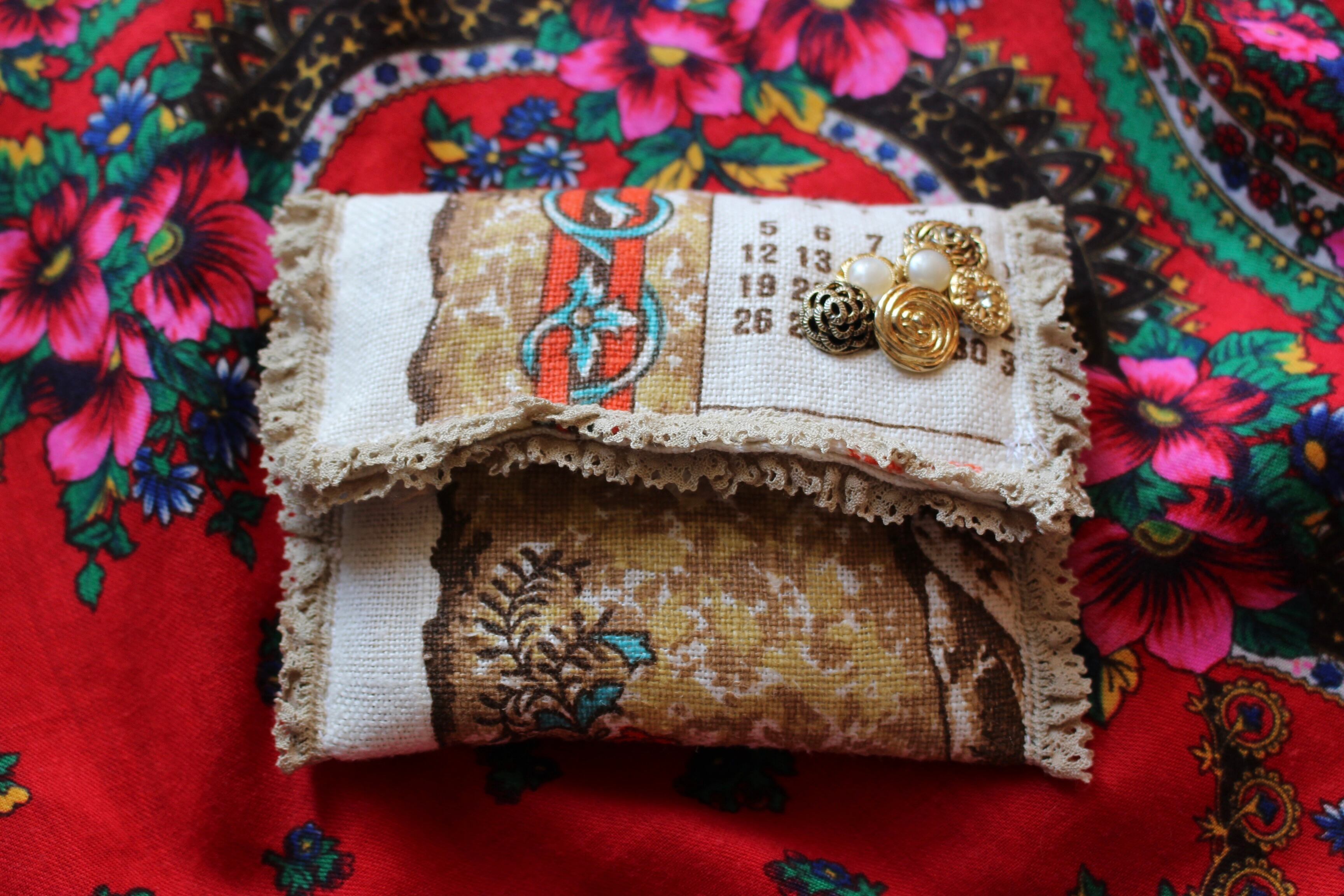 ビンテージのカレンダークロスと刺繍カーテンのハギレを使った小さなポーチになります。