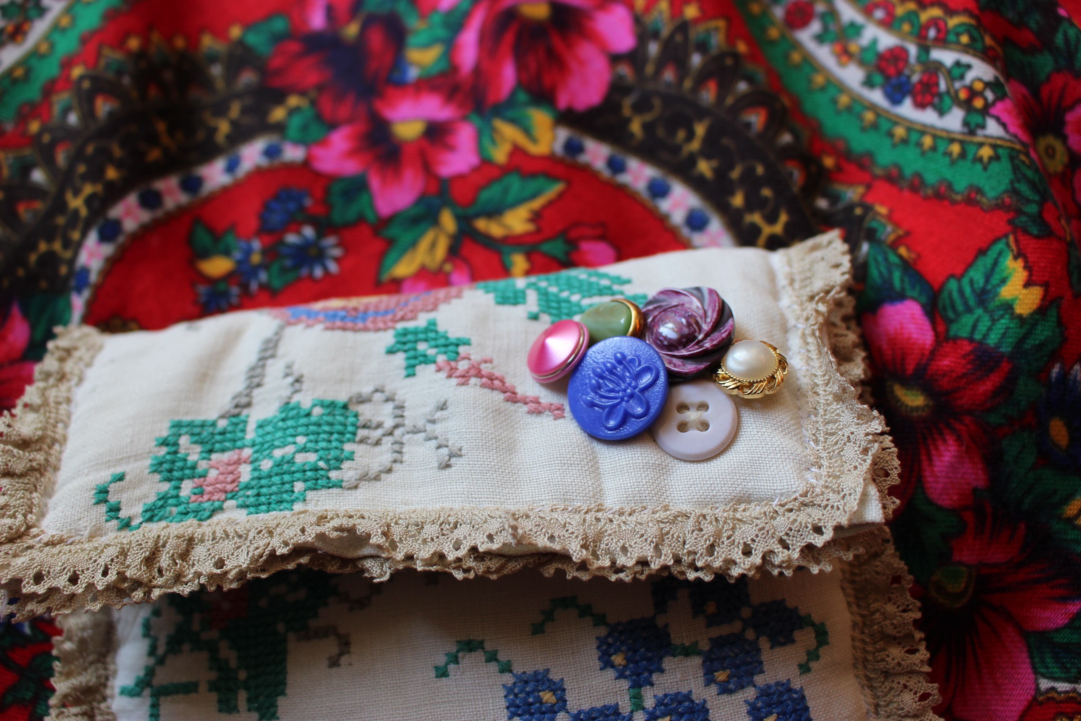 キルトを挟みふかふかにして、右上には日本の古いボタンを飾り付け。