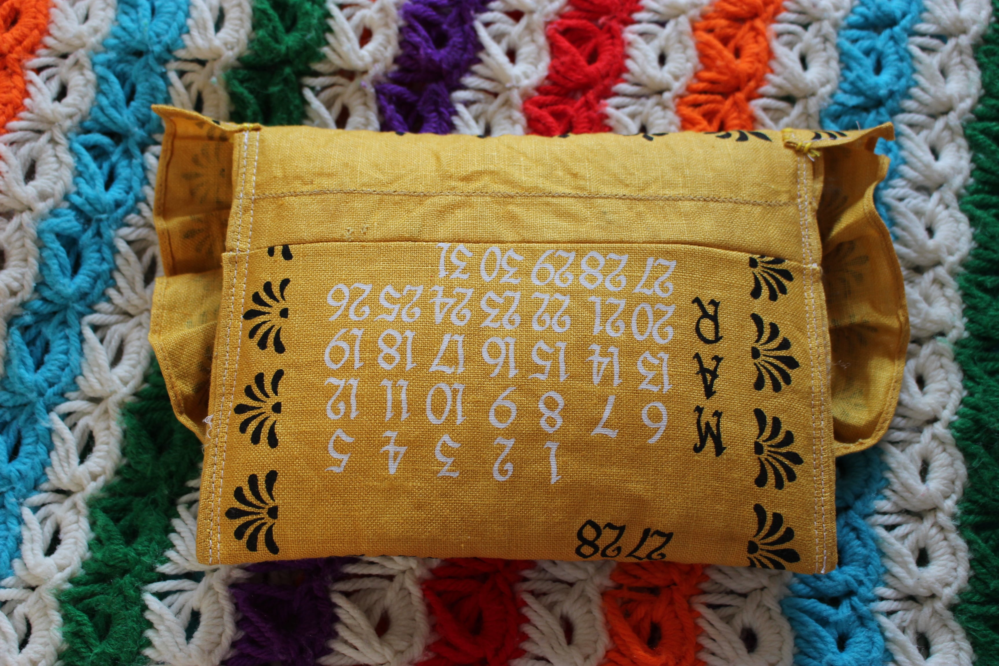 1966's カレンダーファブリックのポーチになります。黄色と黒字の色合いと数字達のデザインが個性的です。中にはキルトを挟んであるのでフワッとした優しい手触り。