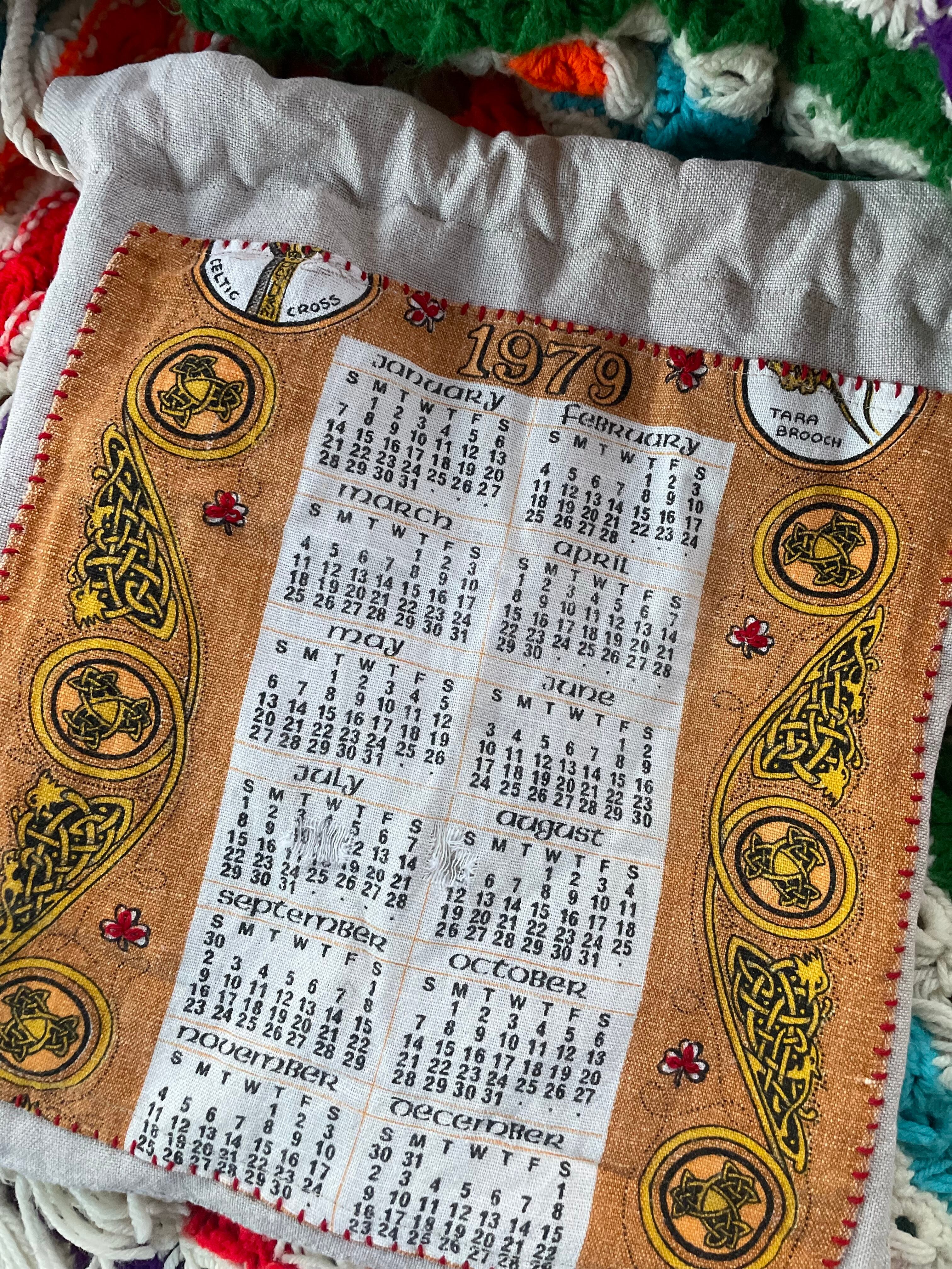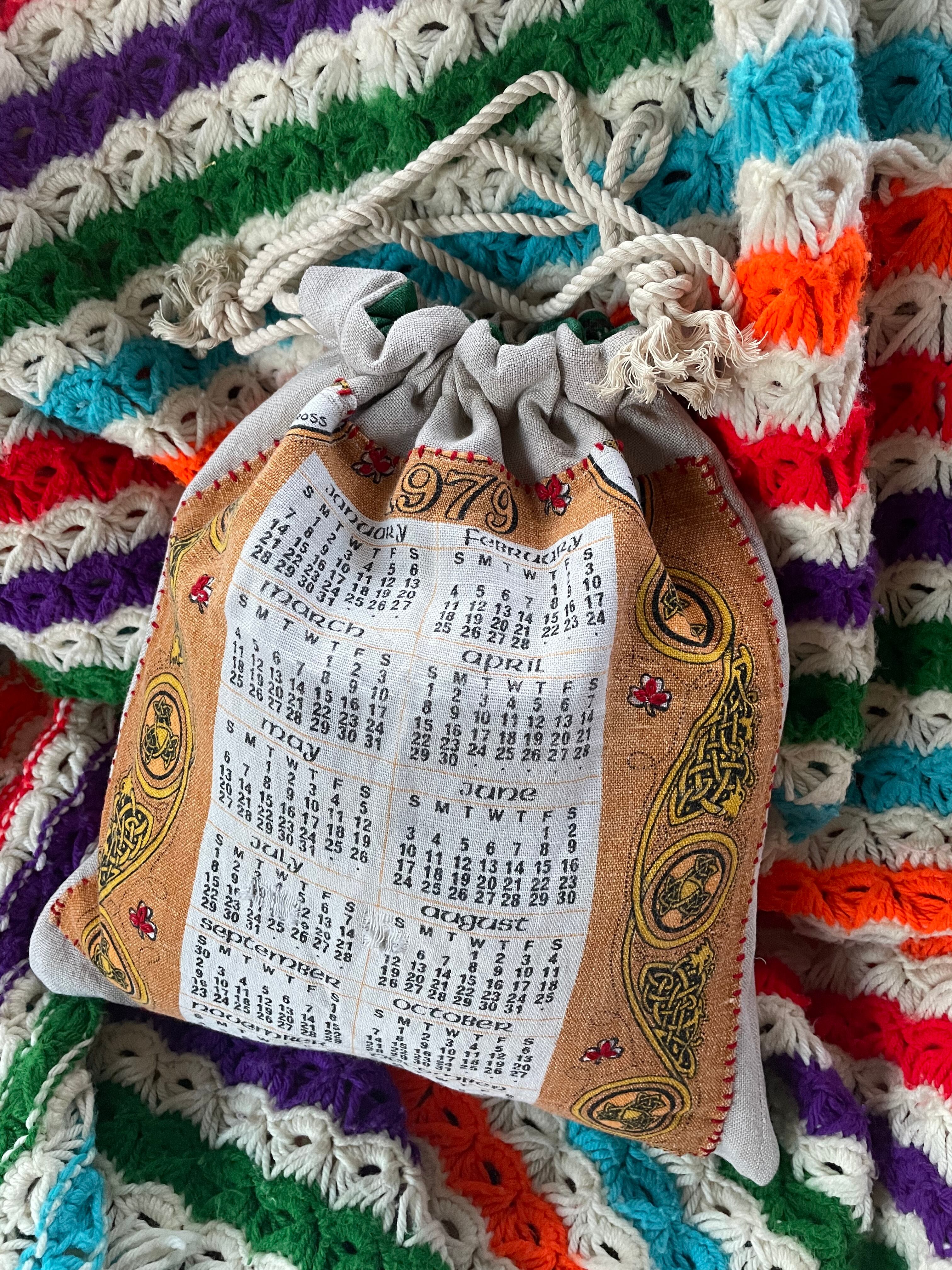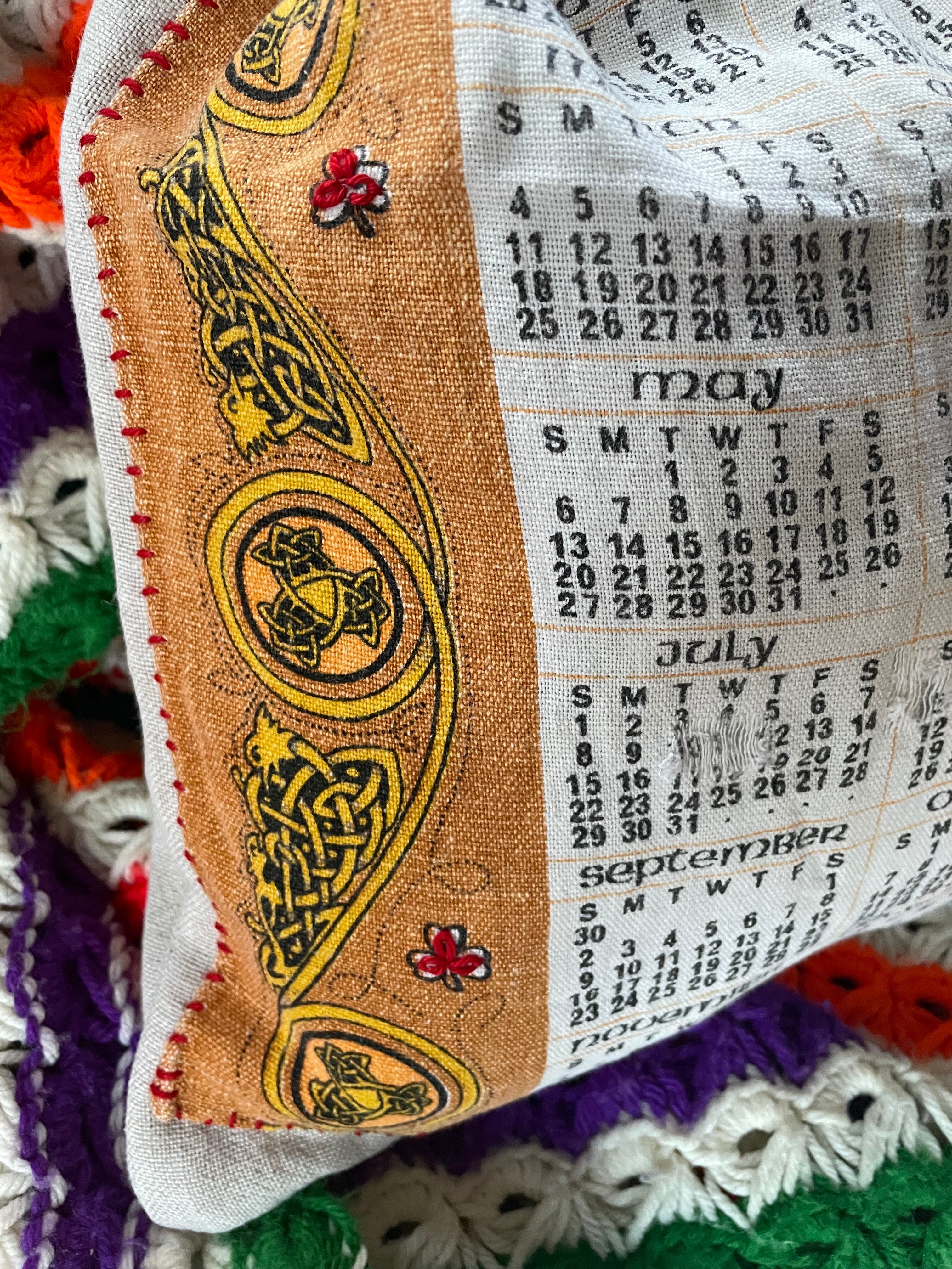 ヨーロッパのお花の刺繍のクッションカバーをリメイクしてバッグにしました。ダメージもありましたが、刺繍部分は綺麗に残っていた為バッグにしました。片側には1979年のカレンダーファブリックを使い、両面違う楽しみ方ができます。