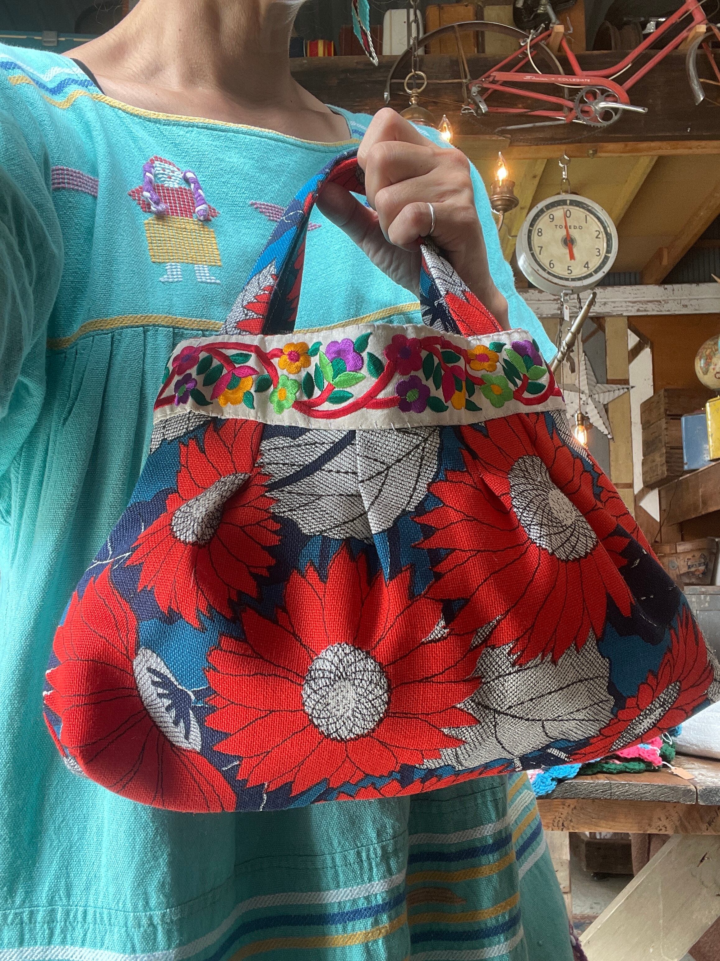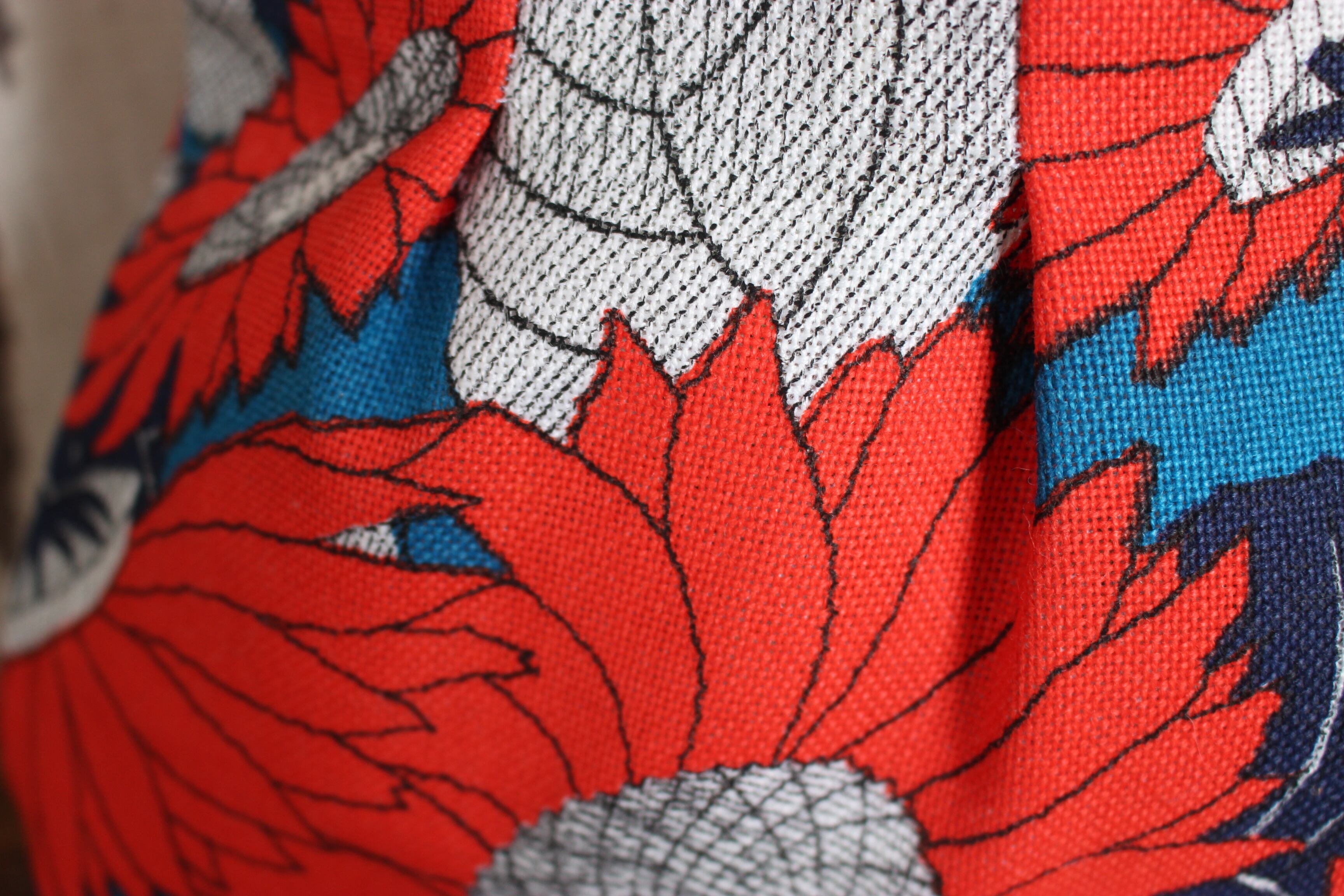 アメリカの赤いお花柄ヴィンテージ生地をたっぷりと使ったbagになります。コロンとした形が可愛いです。