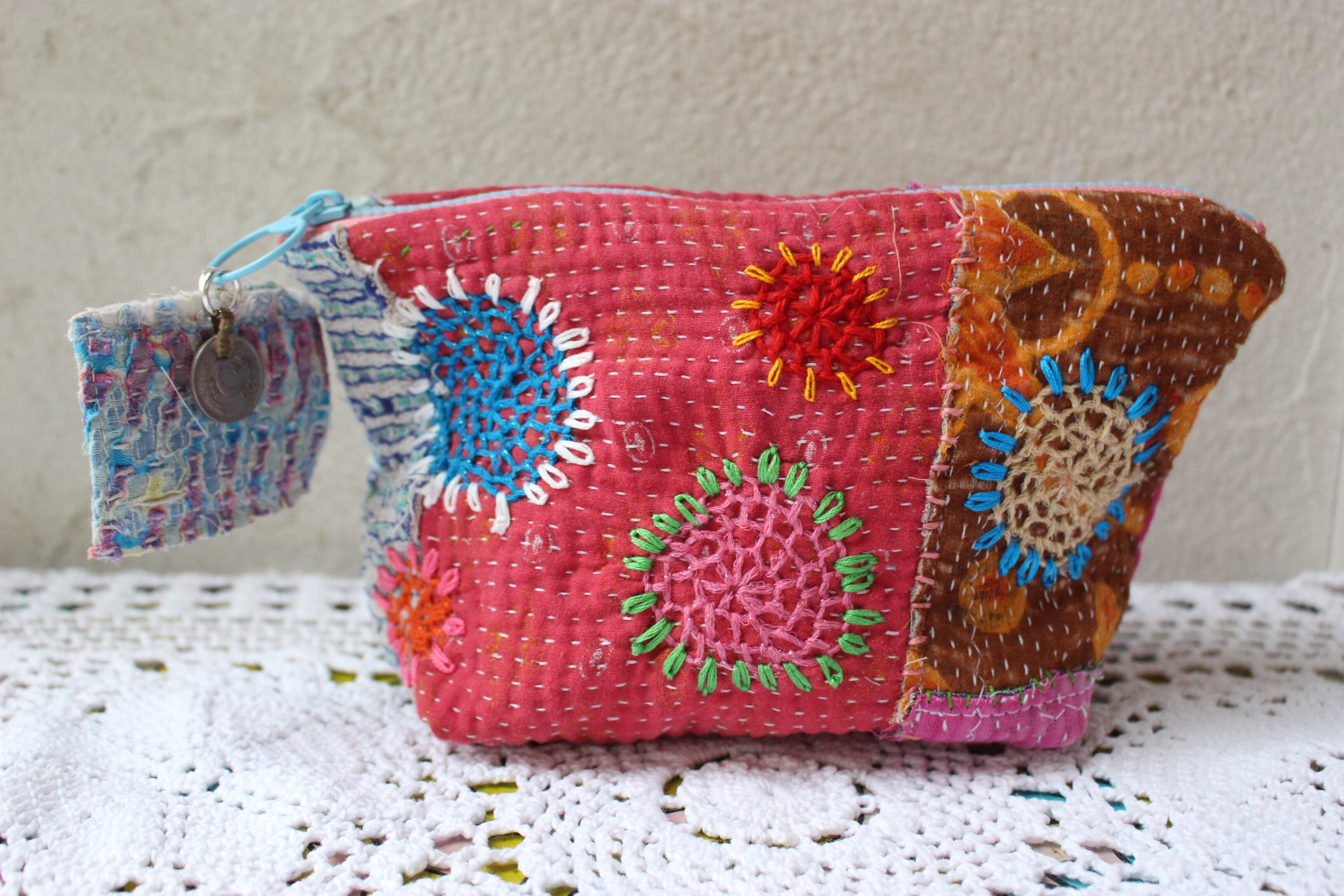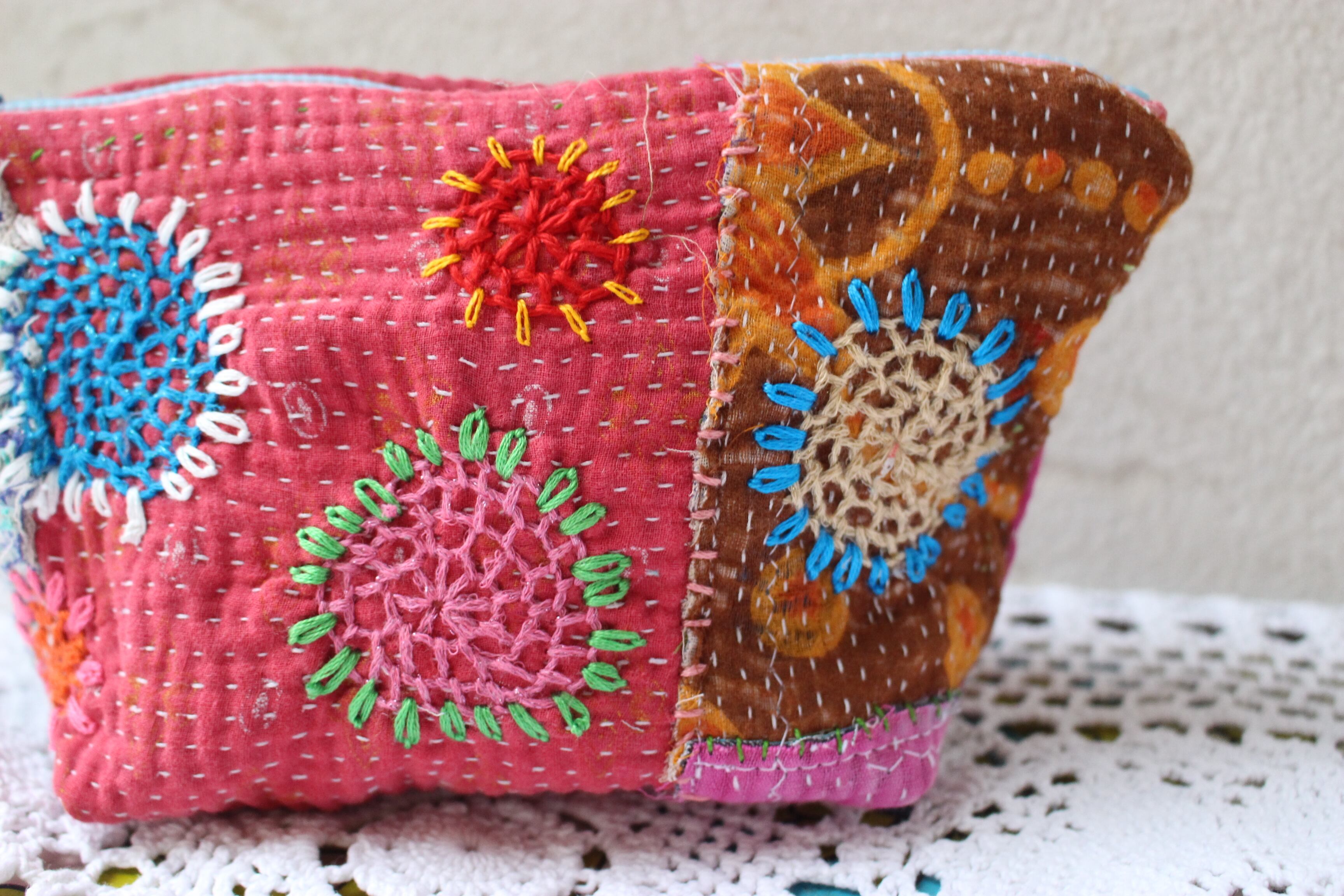 赤とピンク、茶色のハギレを繋ぎ合わせました。