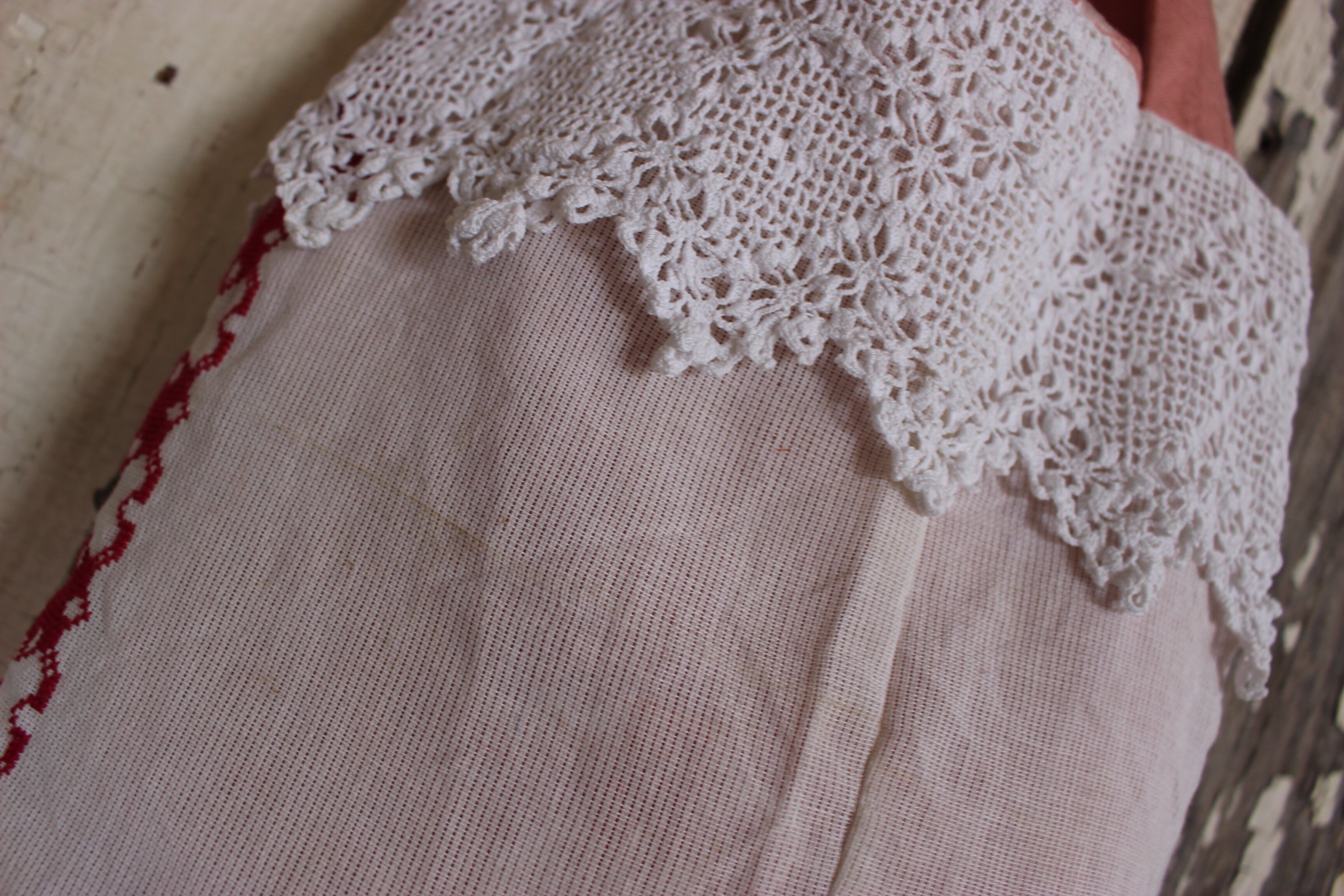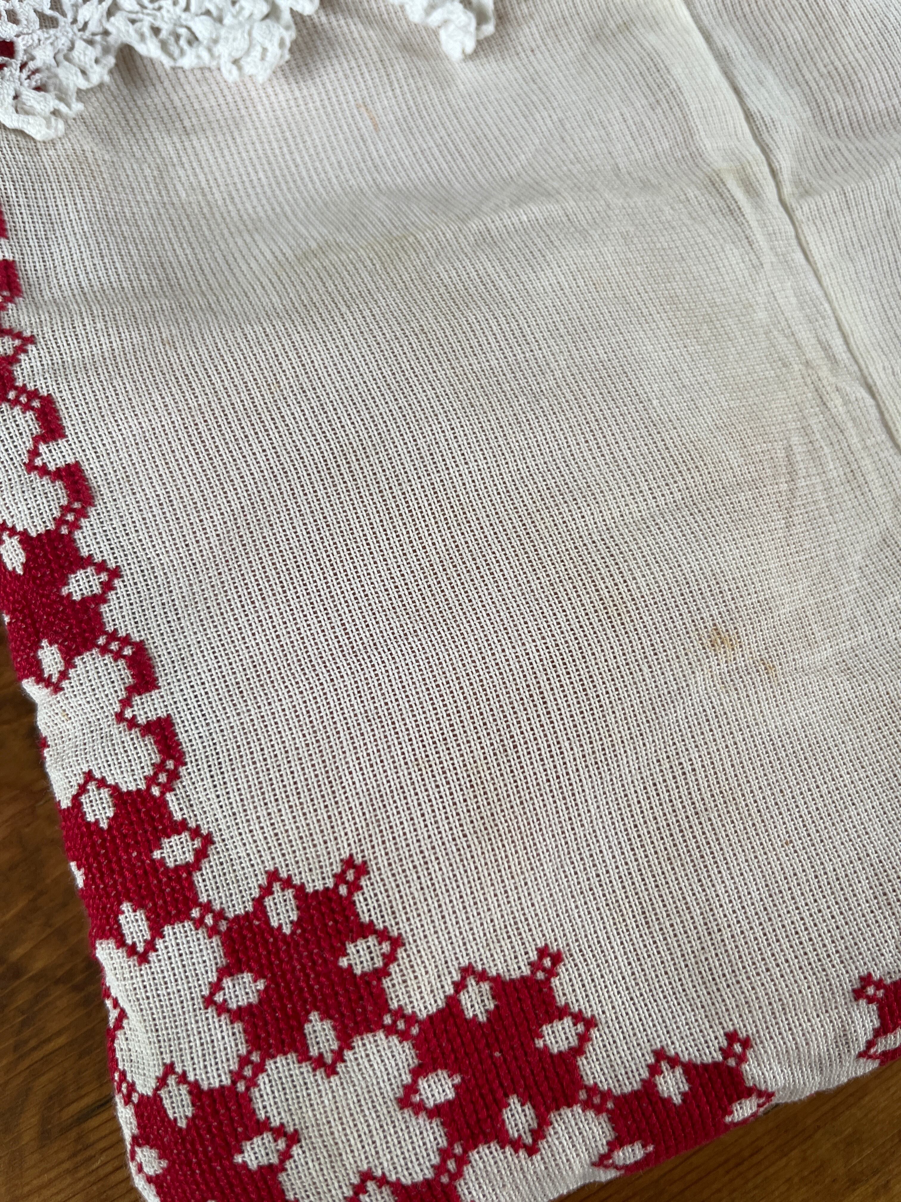 綺麗な赤が細かいステッチ。フチには太めのアンティークレースを飾りました。