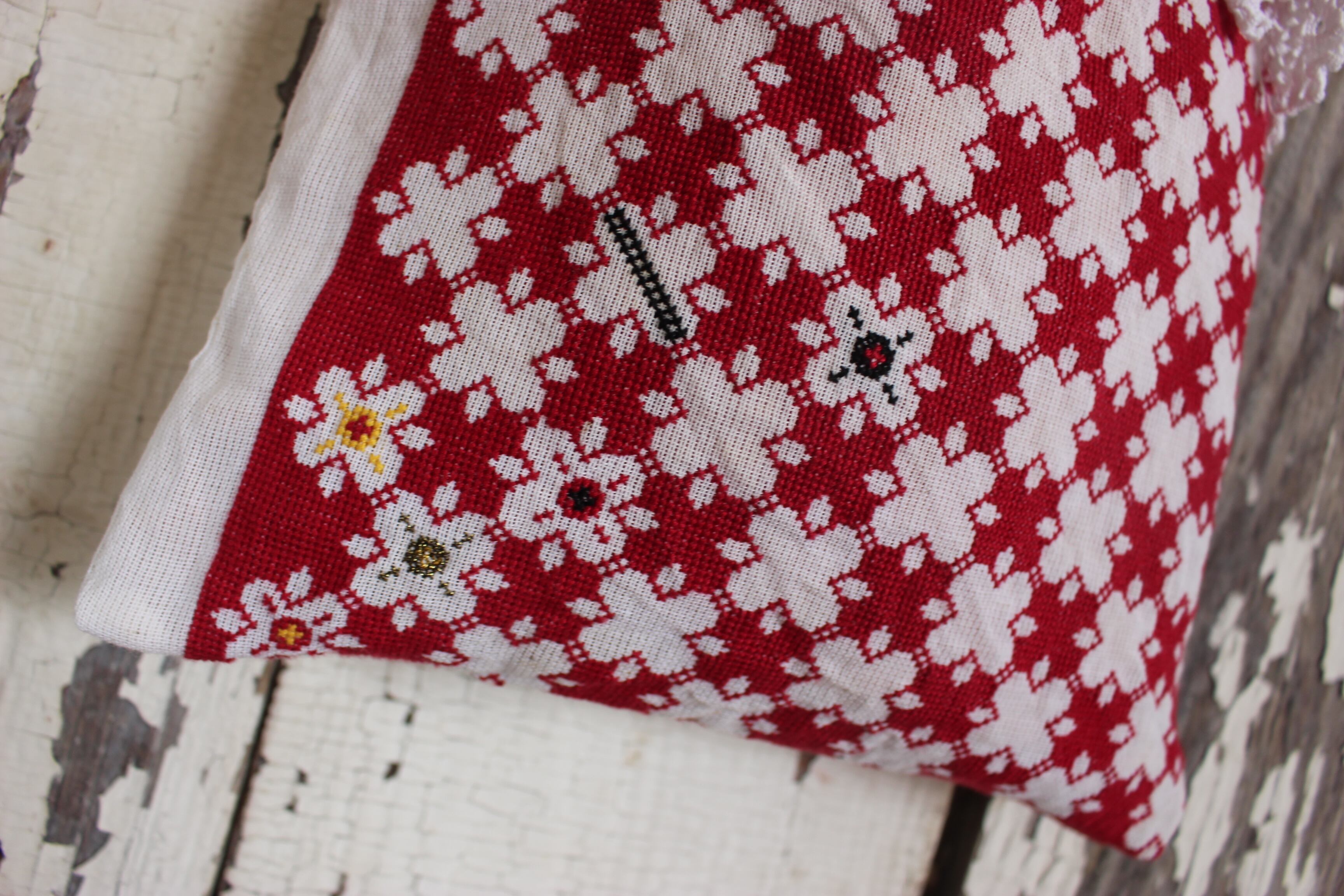 真っ赤な糸のクロスステッチの刺繍のハギレ生地。