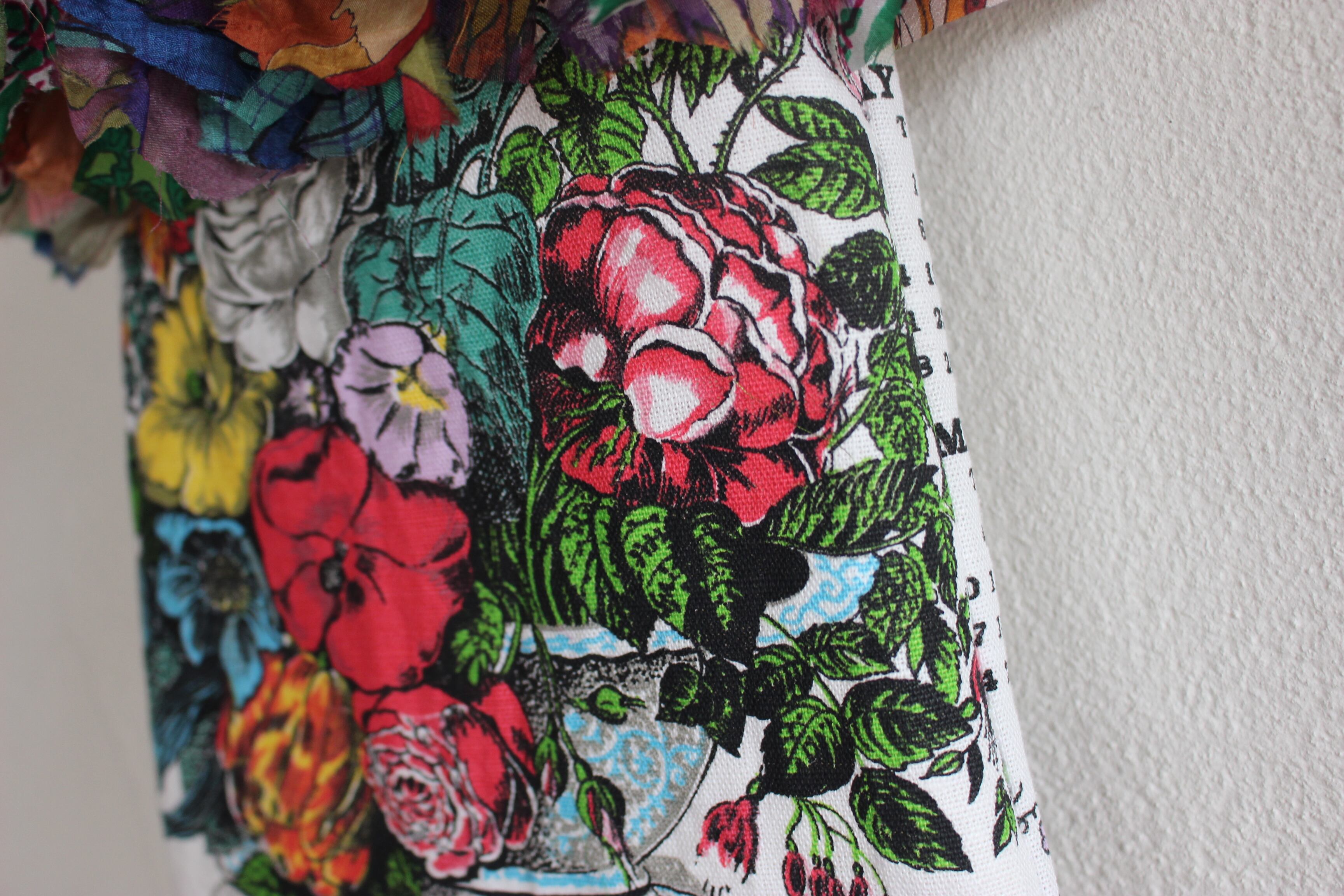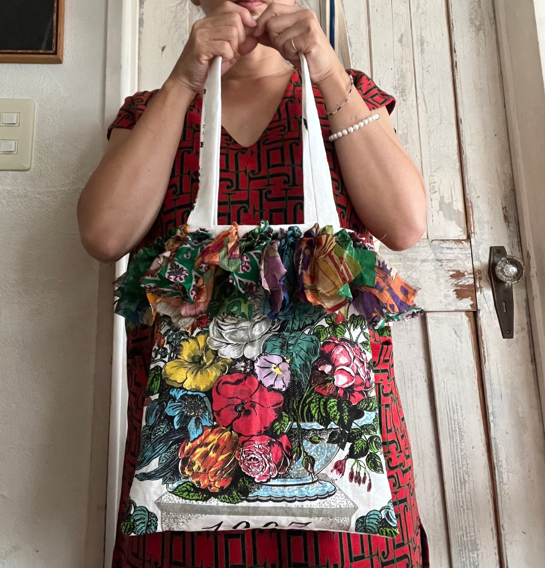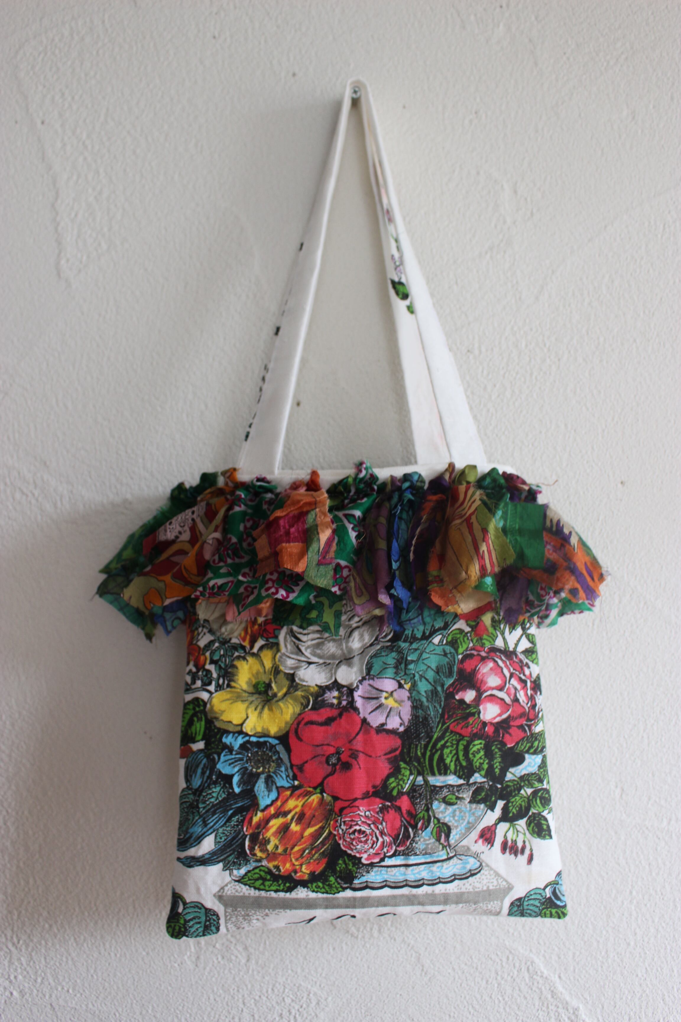 ふさふさと可愛らしいハギレの古き良きデザイン模様の組み合わせが世界で1つのbagになりました。