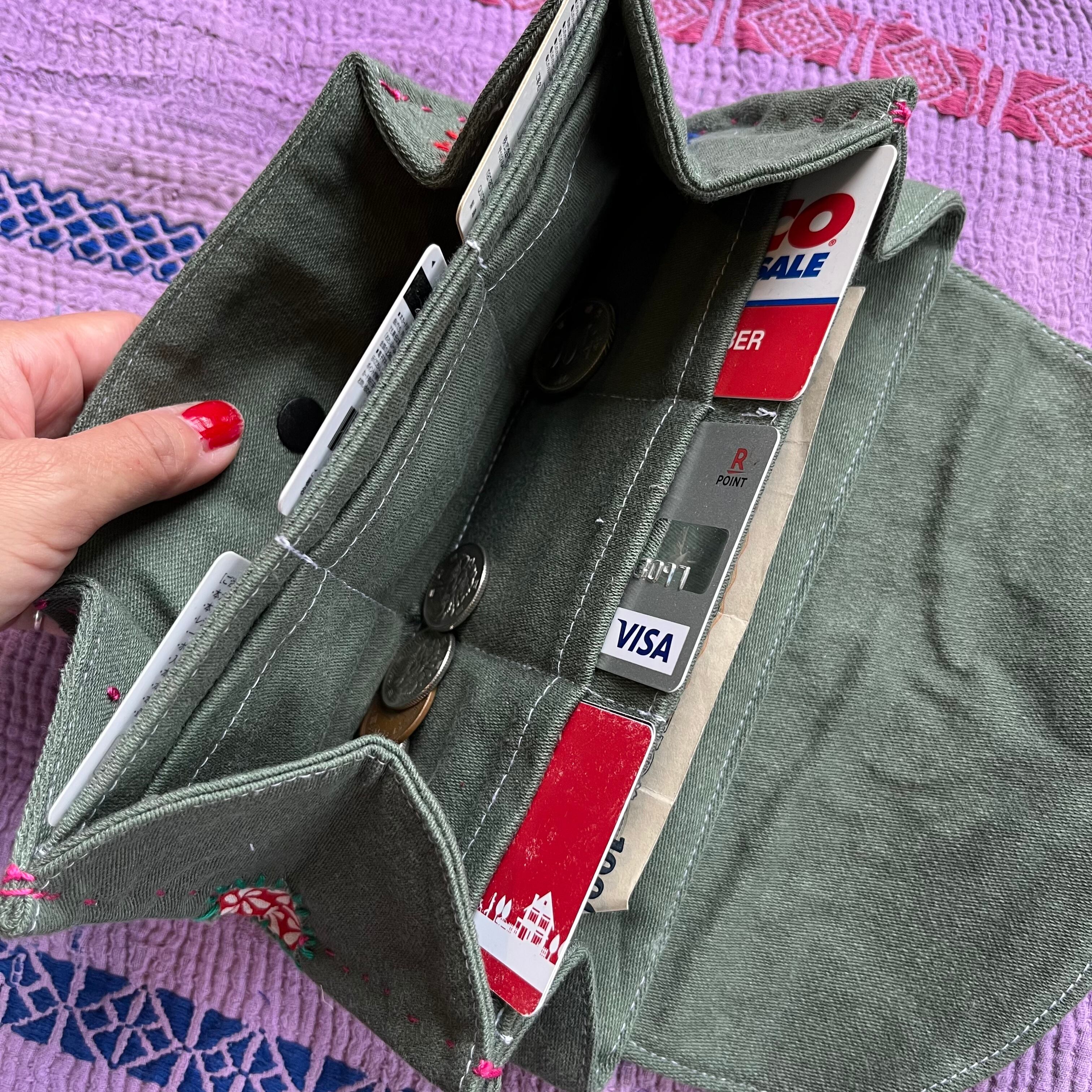 古着のカーキのbagをリメイクしたお財布になります。穴の部分からビンテージ生地がチラホラと見えます。