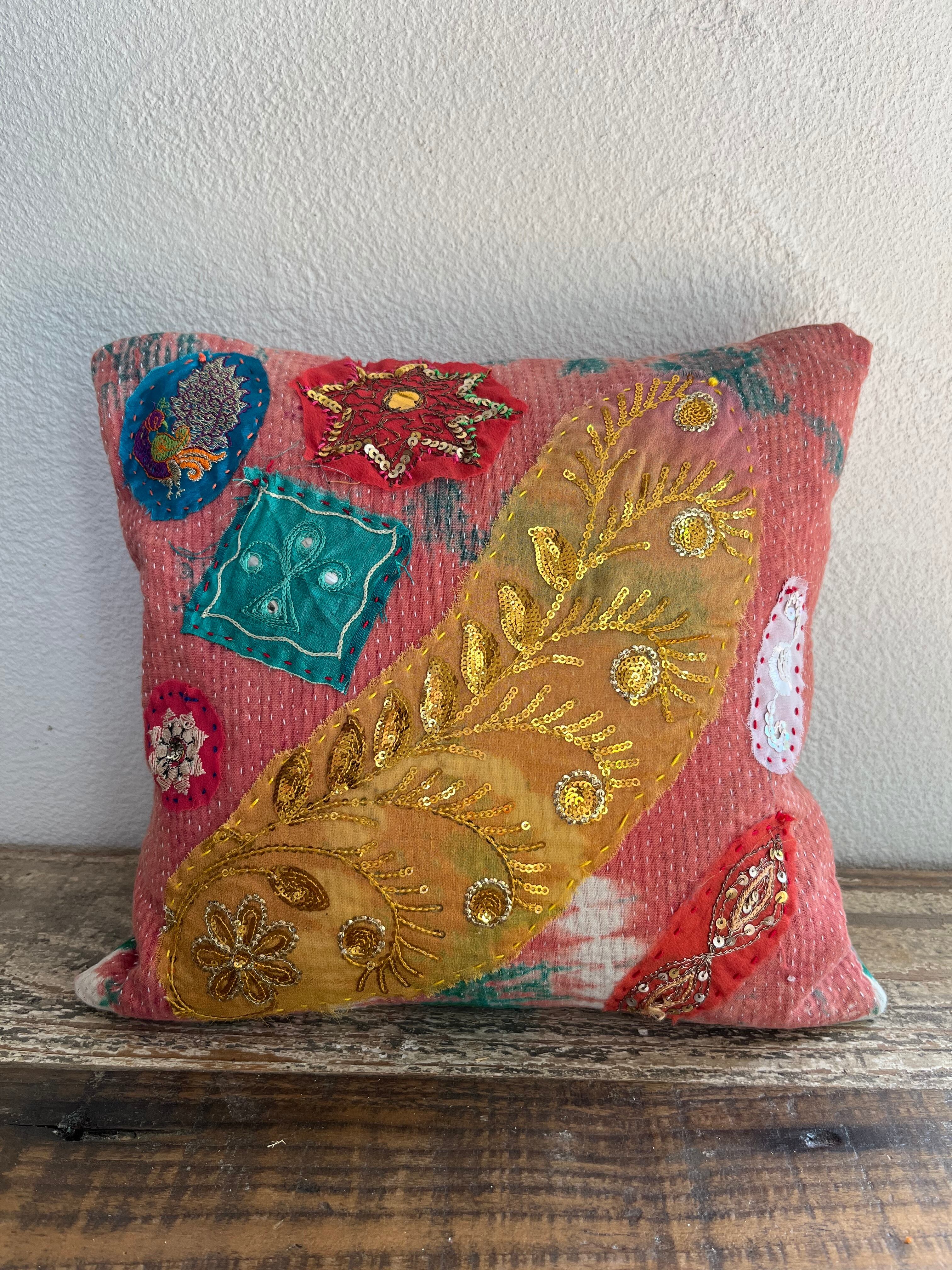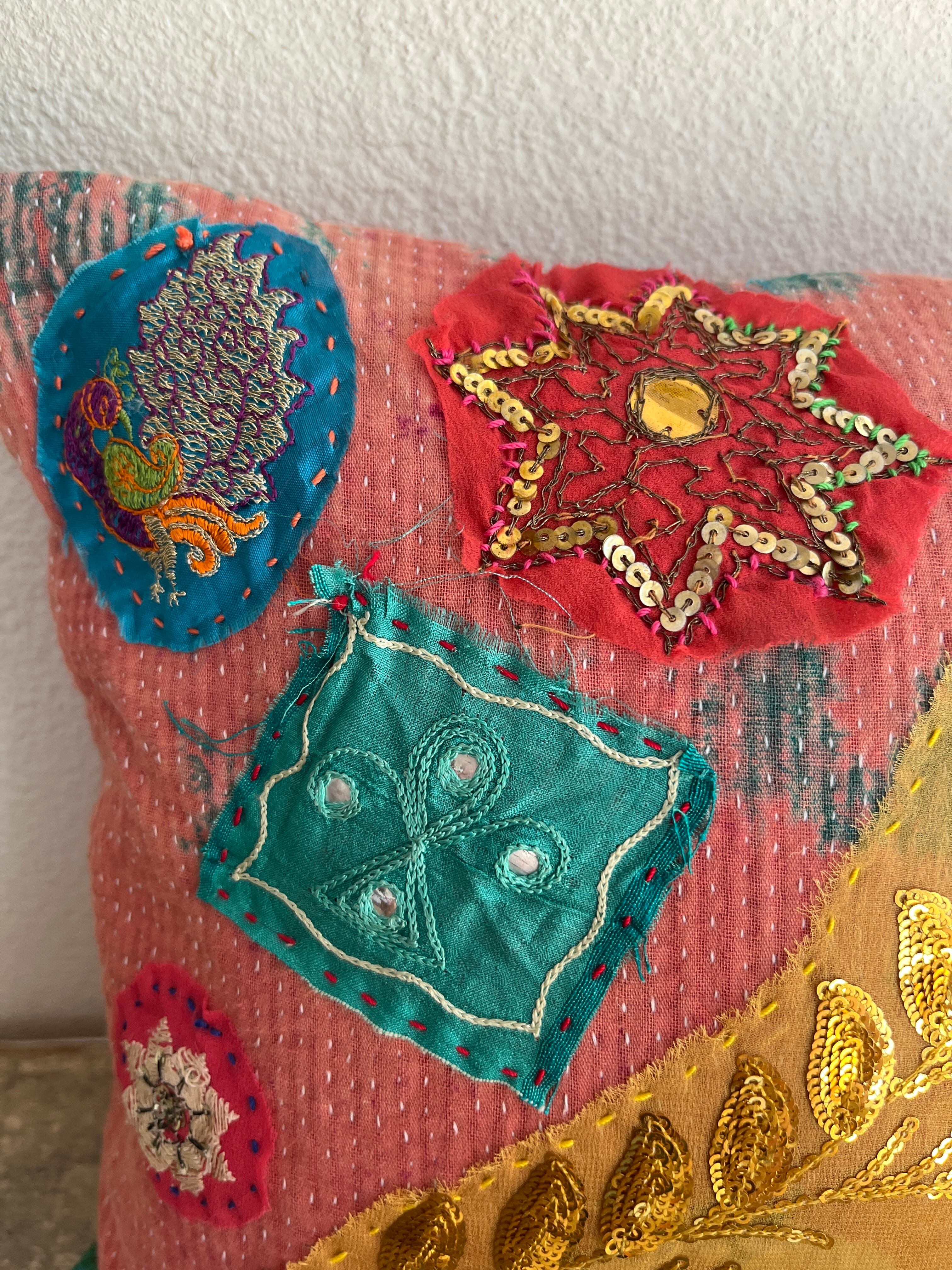 スパンコールや刺繍が施されたハギレを、カンタ生地に装飾をし、クッションに仕立てました。