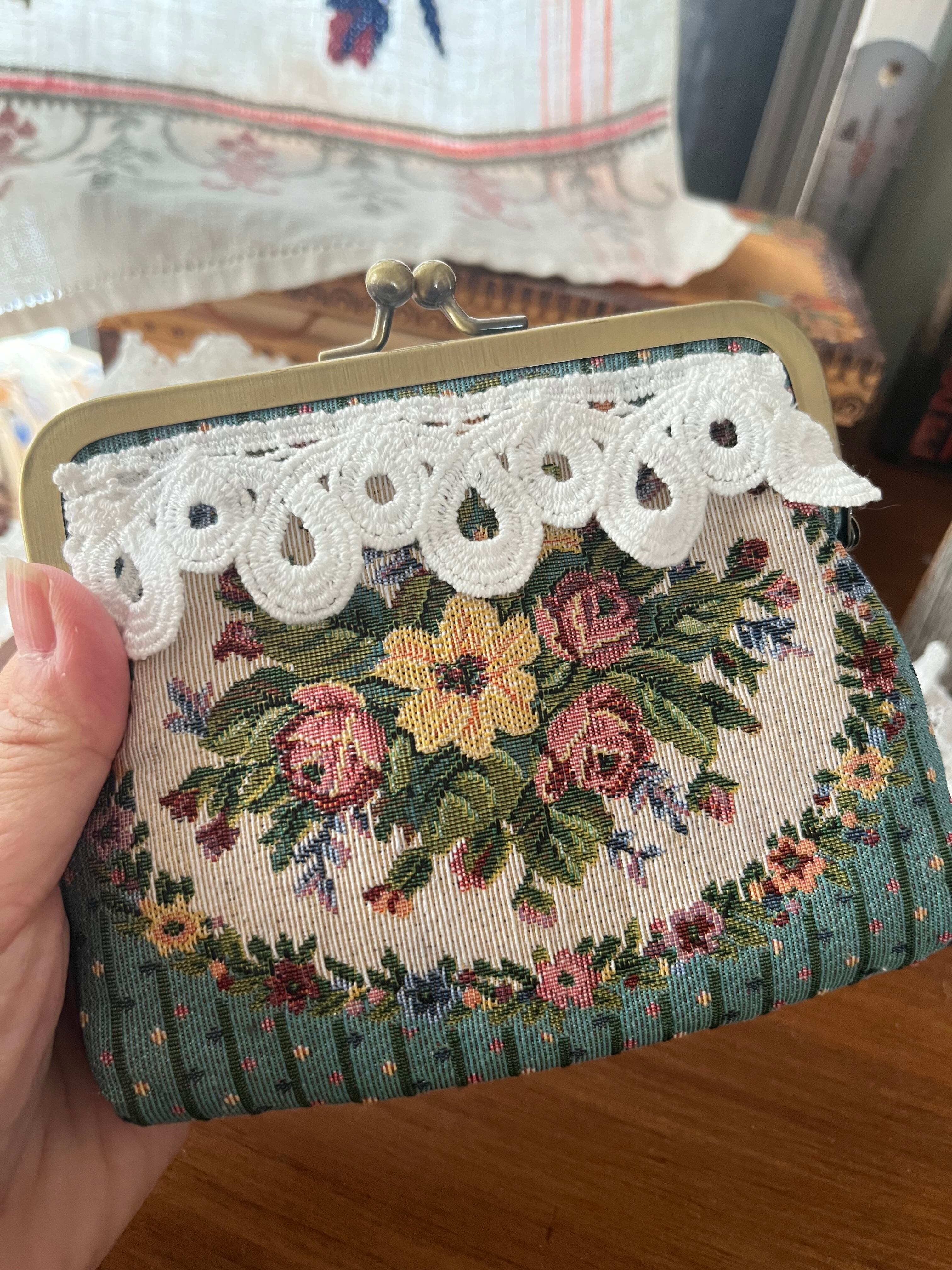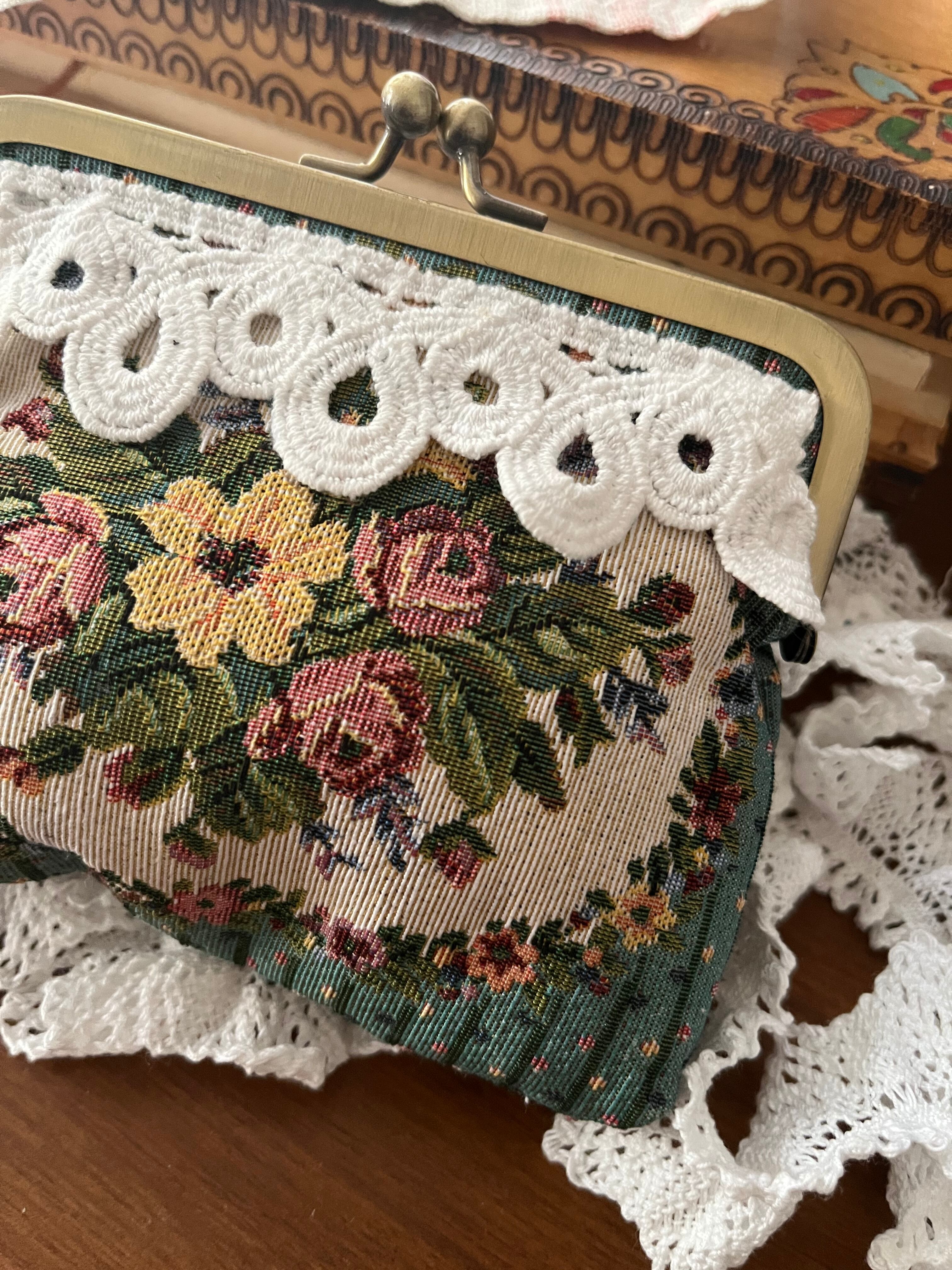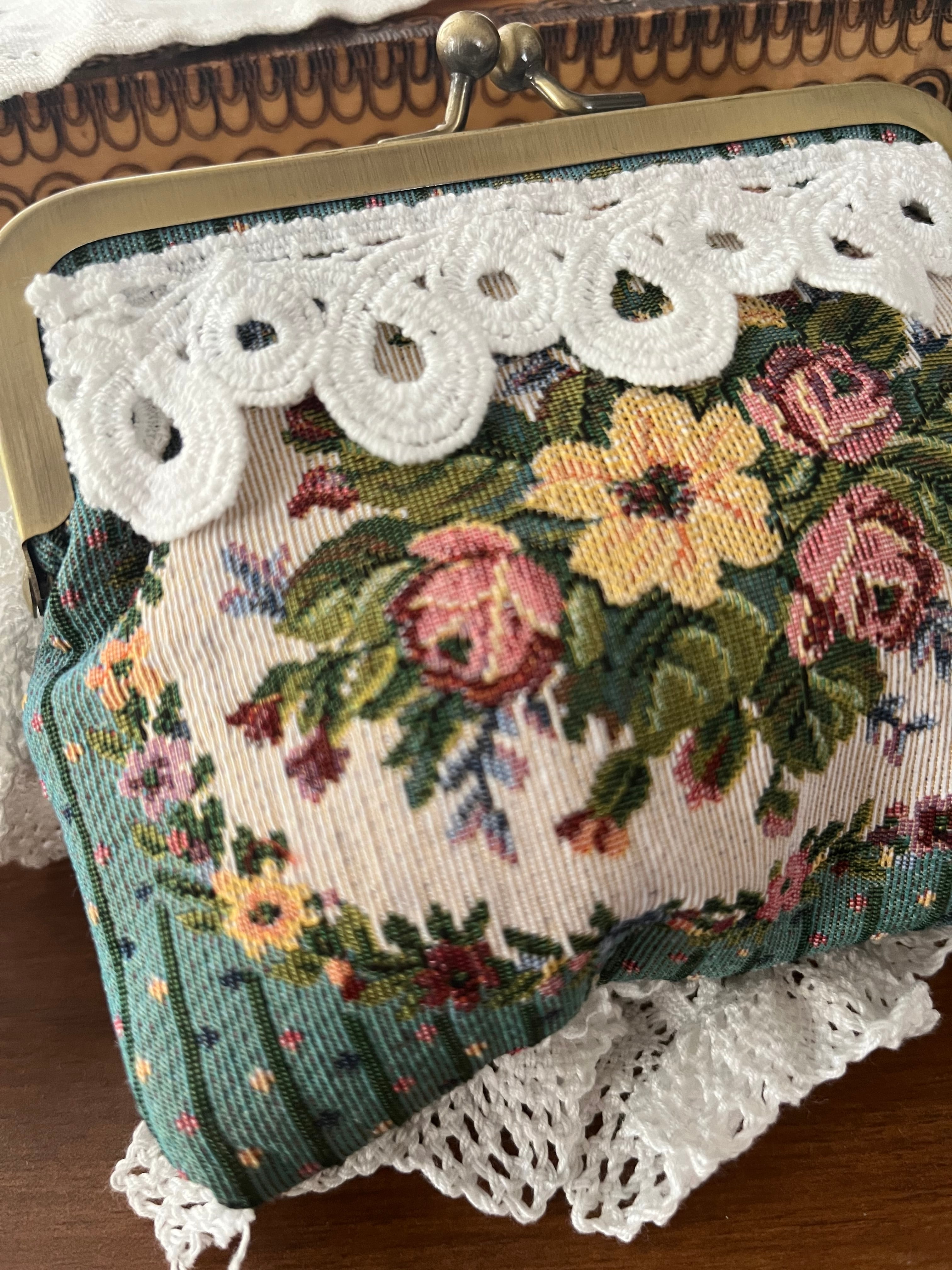 お花模様のポーチにレースを付けてリメイクしました。