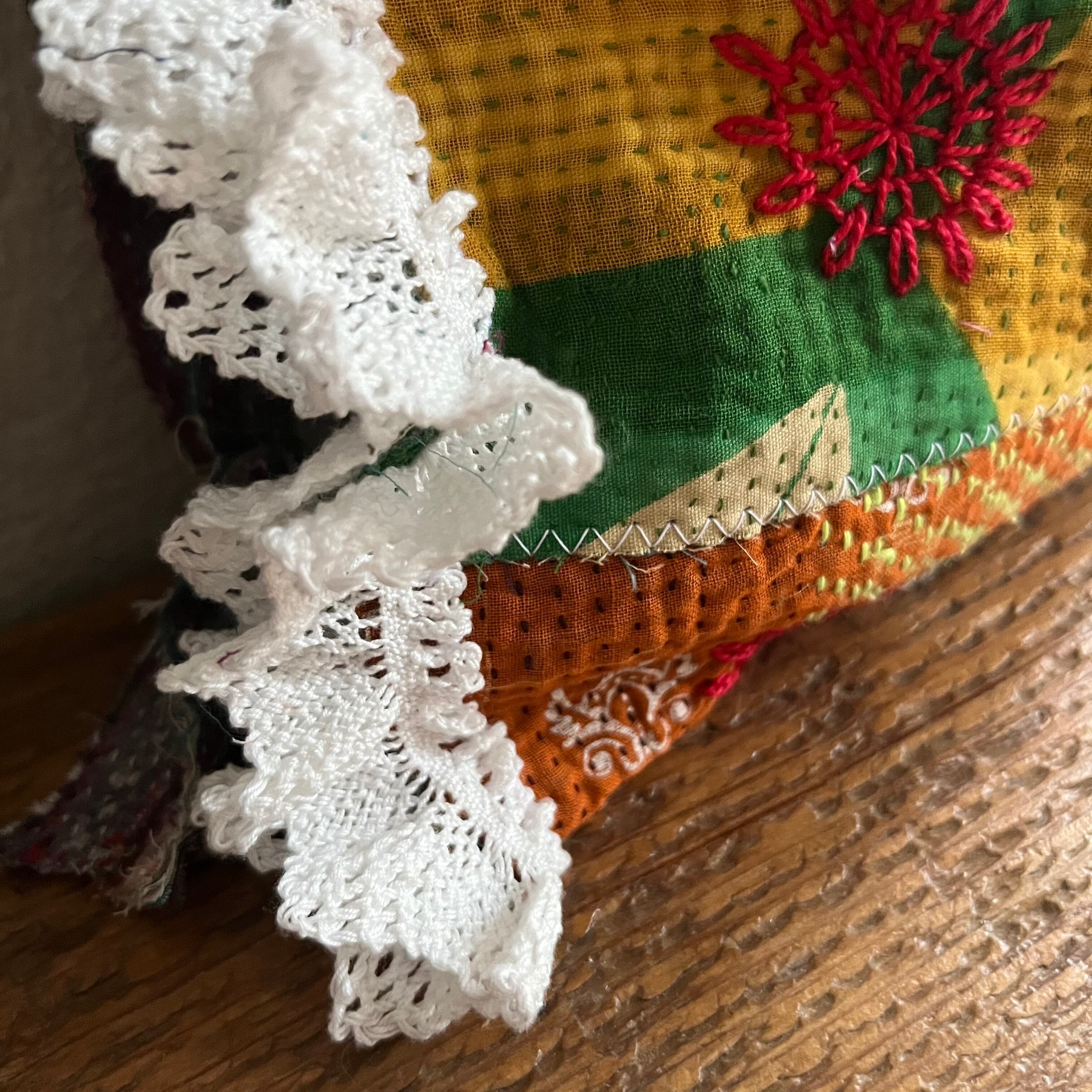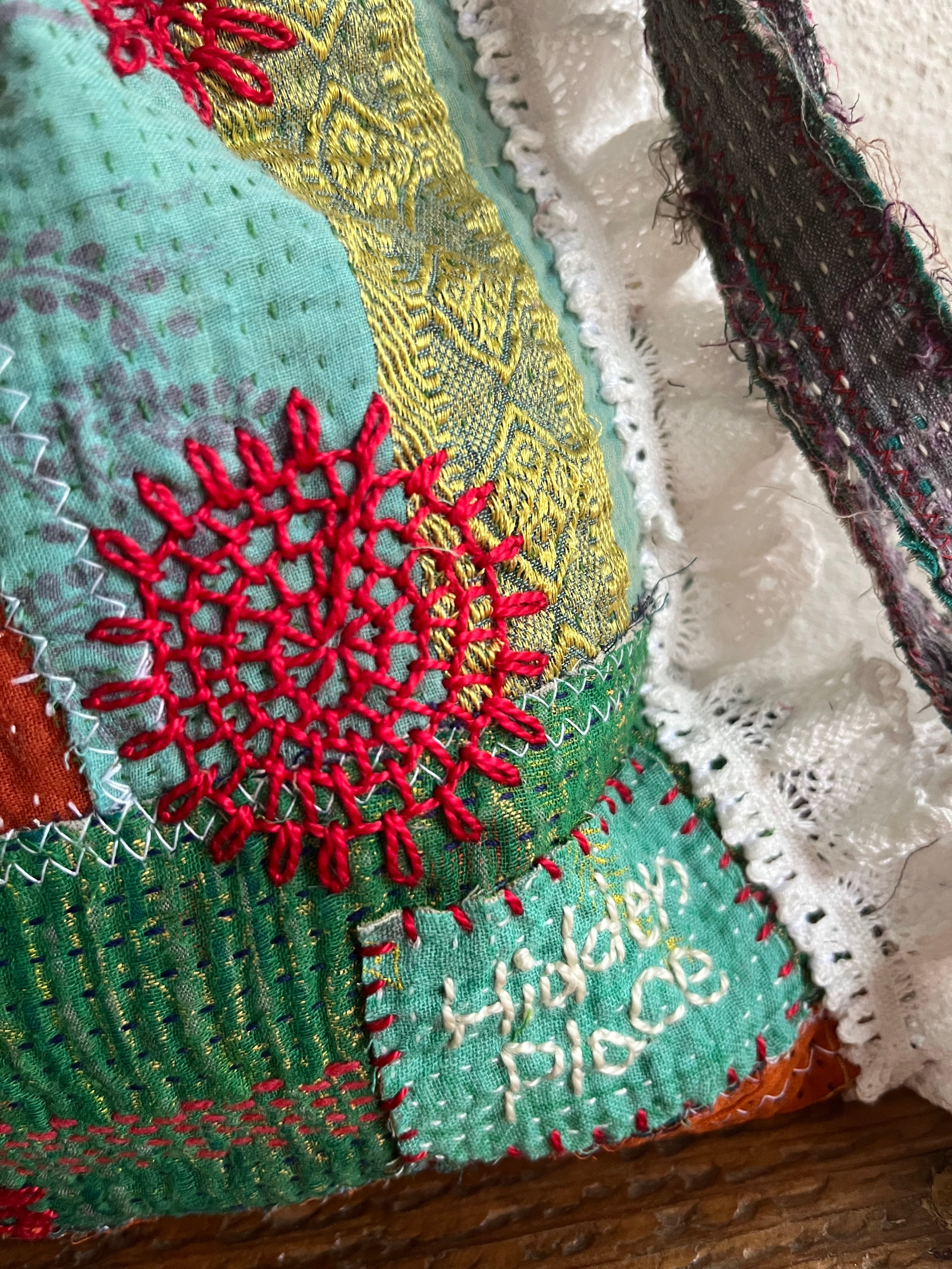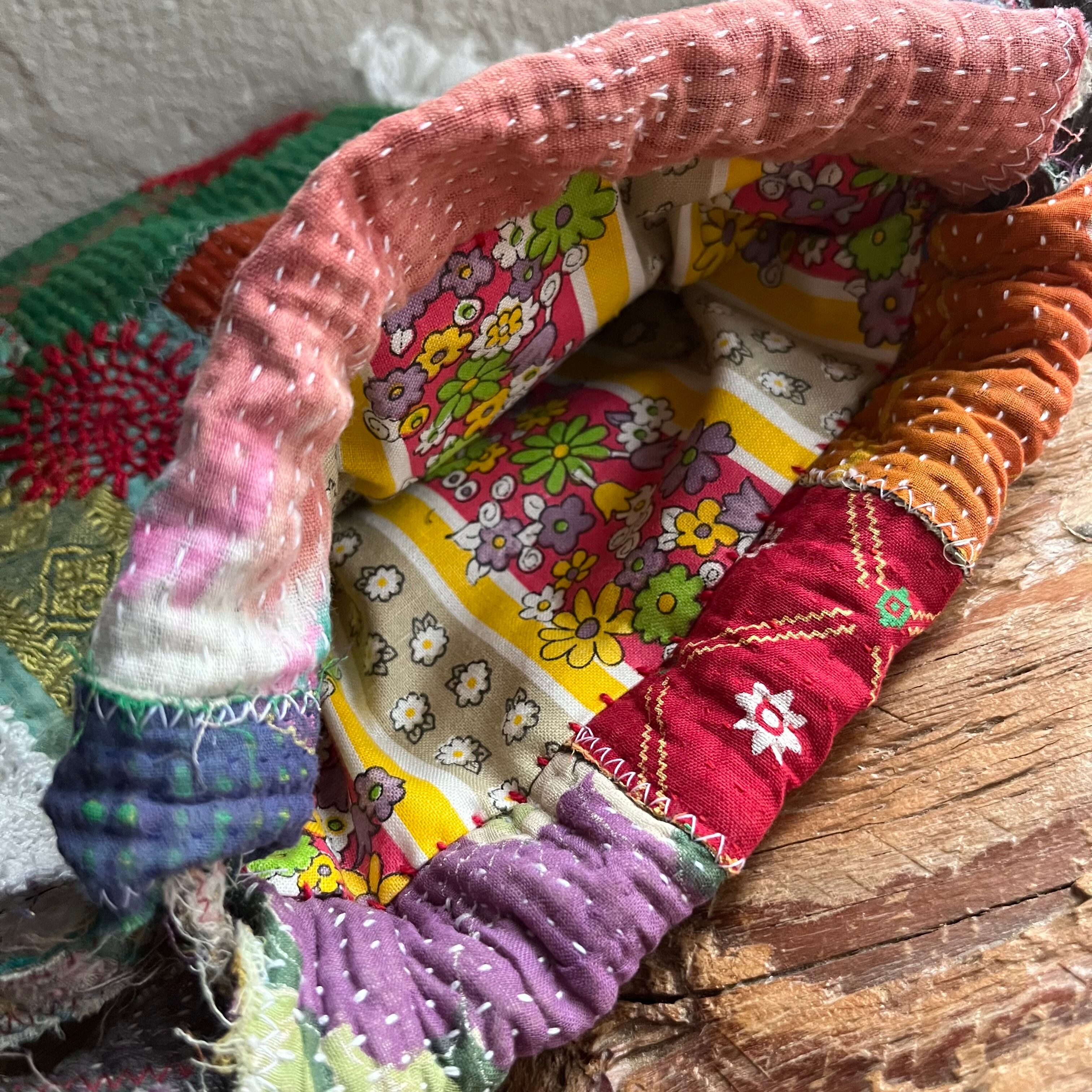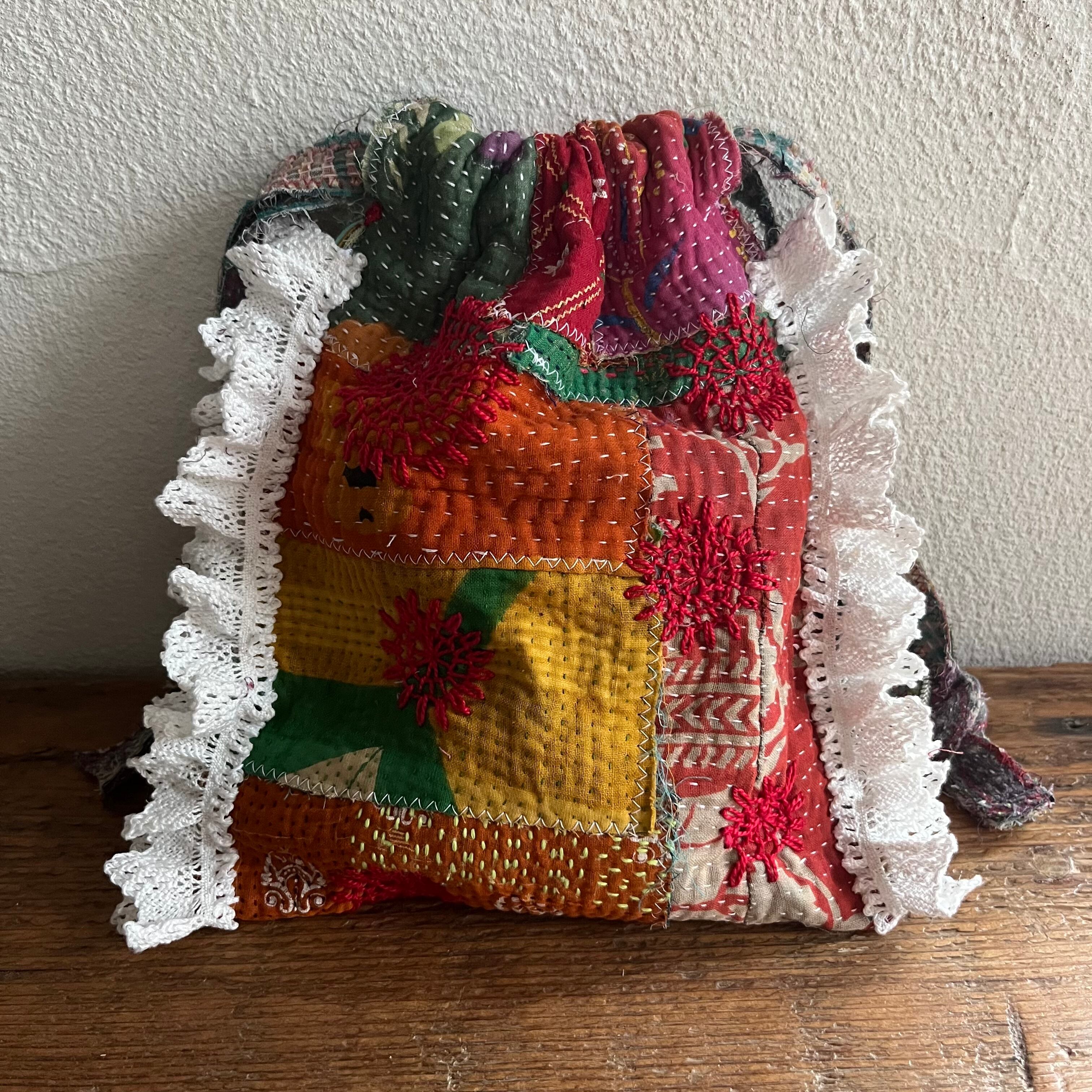赤い糸でタンバリンステッチをしました。カラフルなカンタ生地の中に赤い糸が可愛いです。