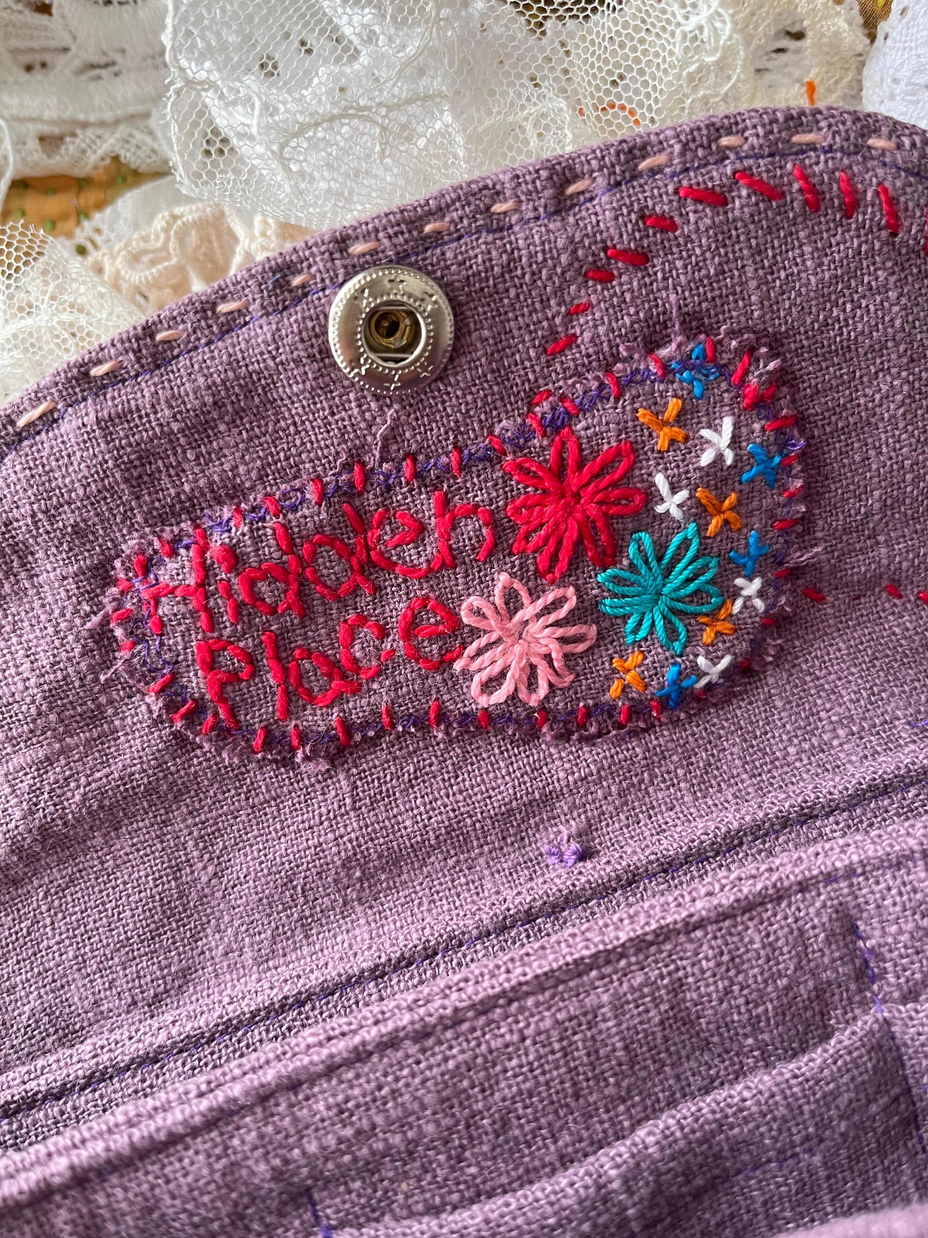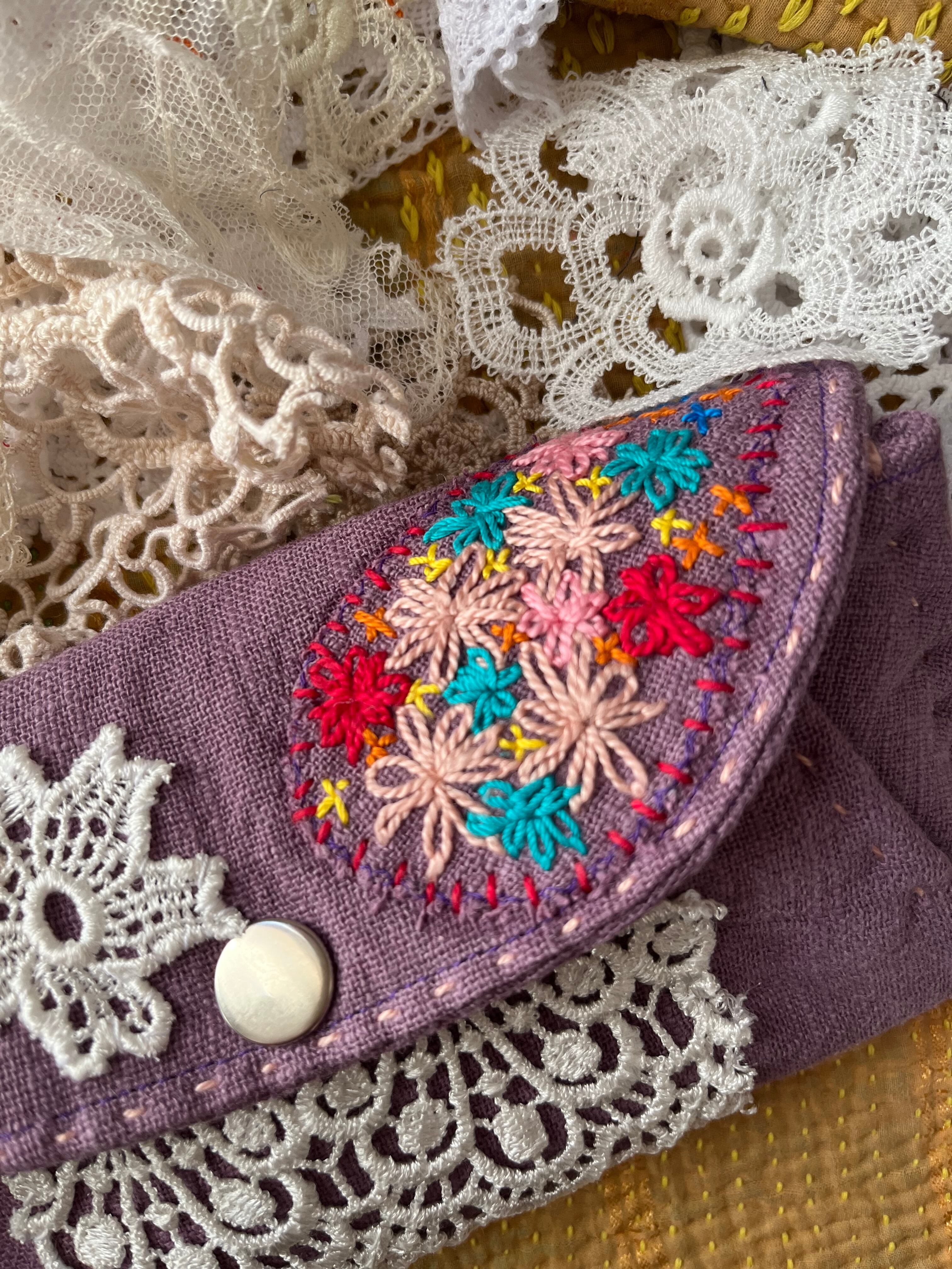春らしいラベンダーカラーのリネンな刺繍とモチーフを付けた長財布になります。