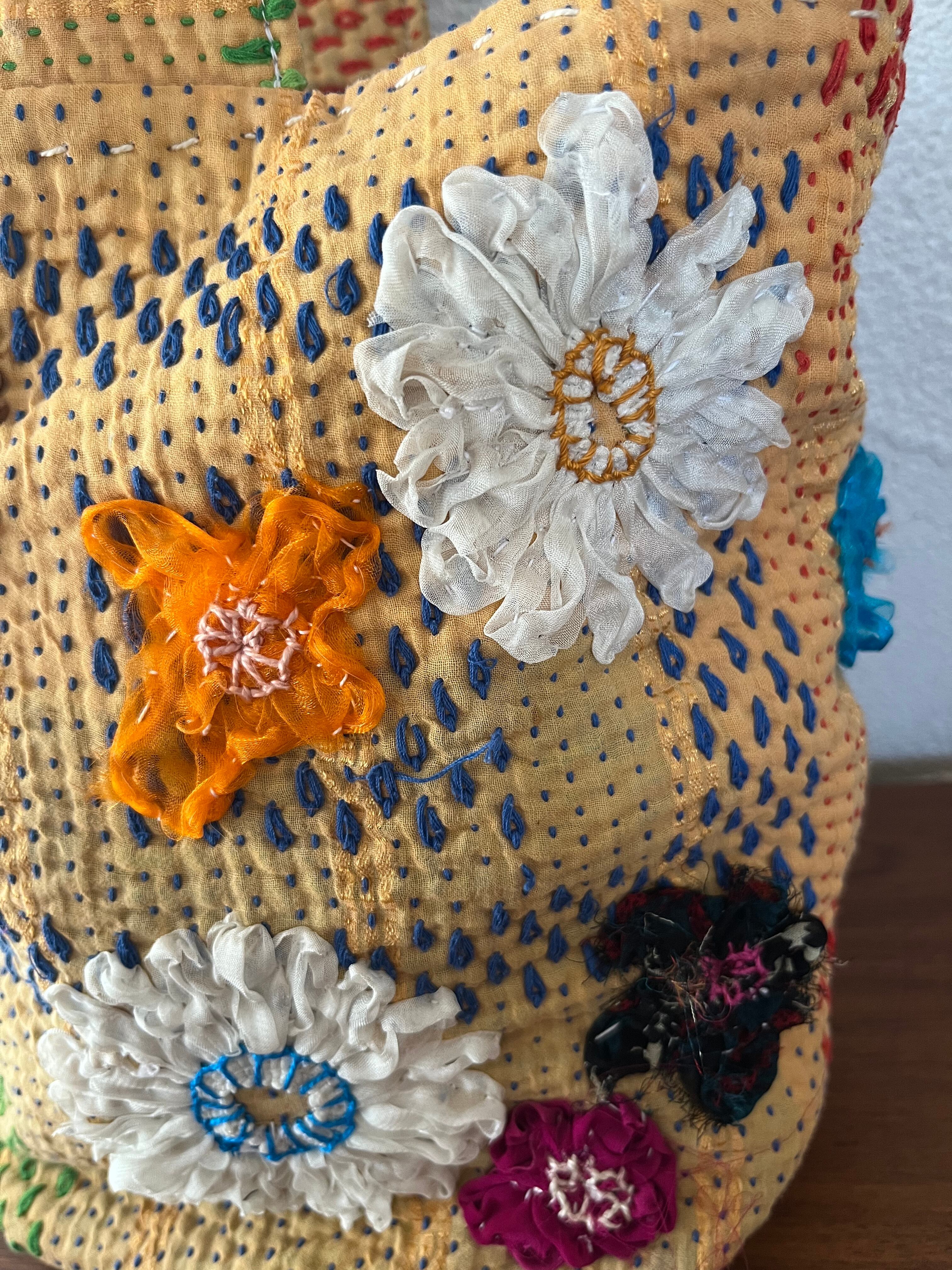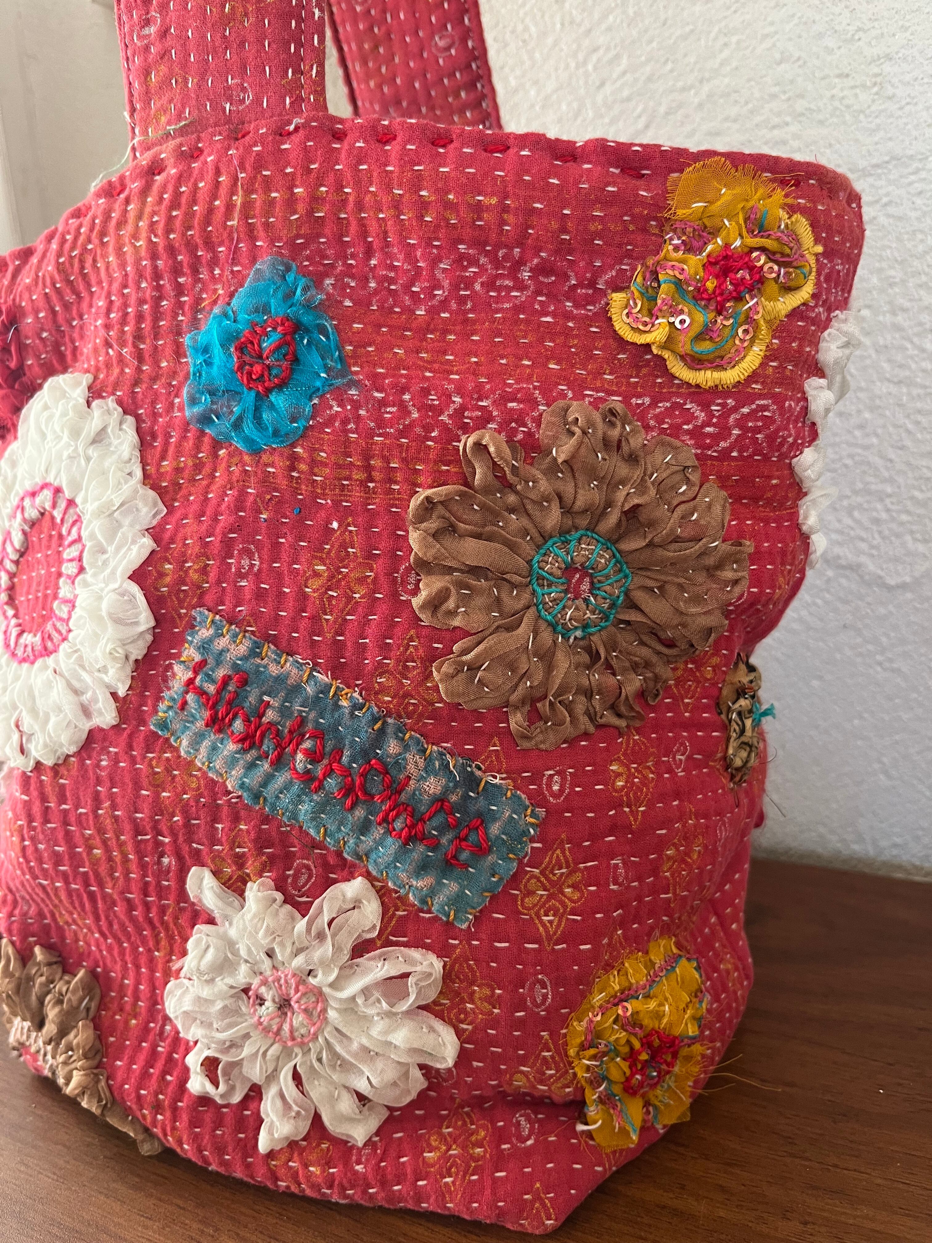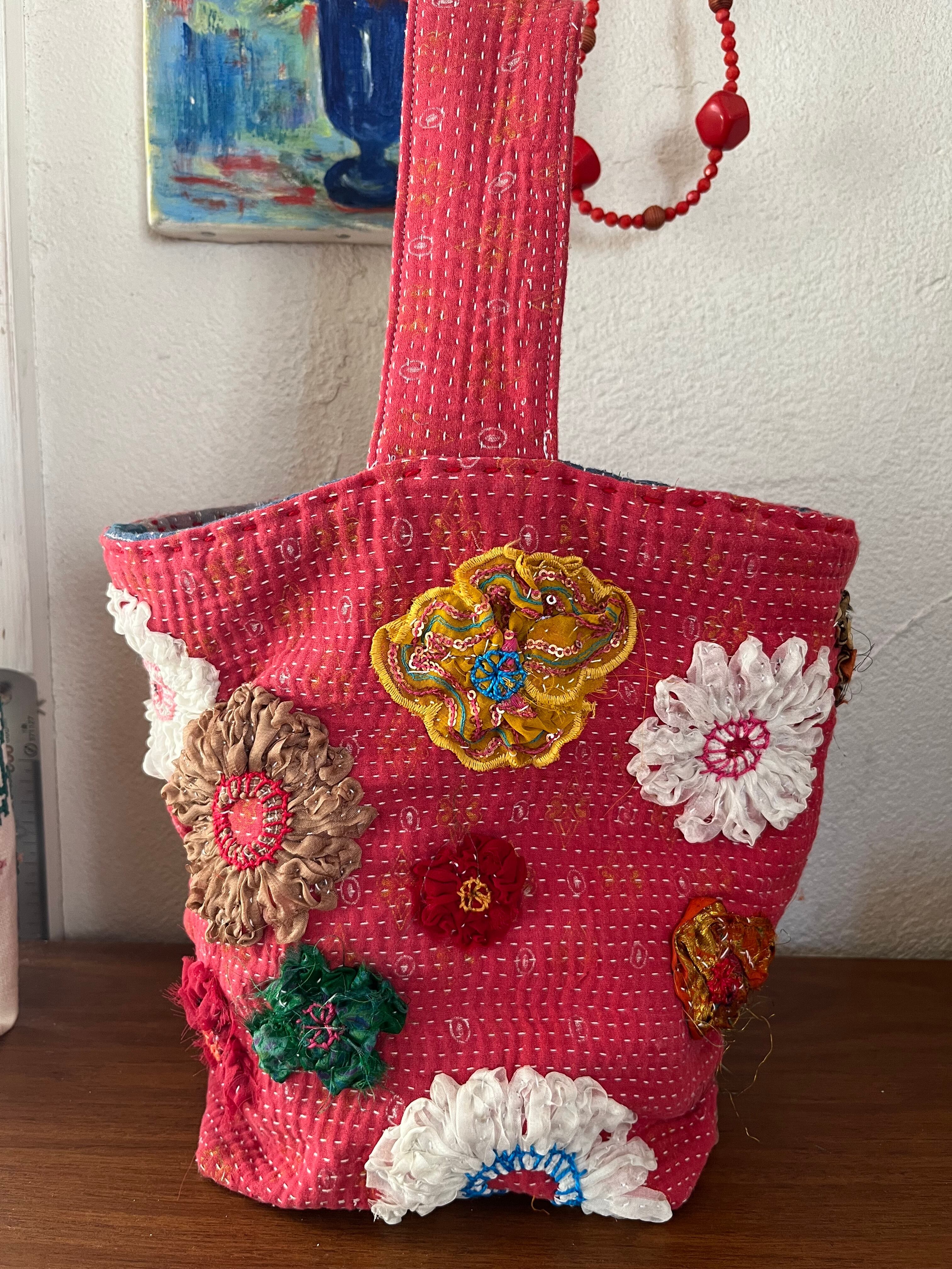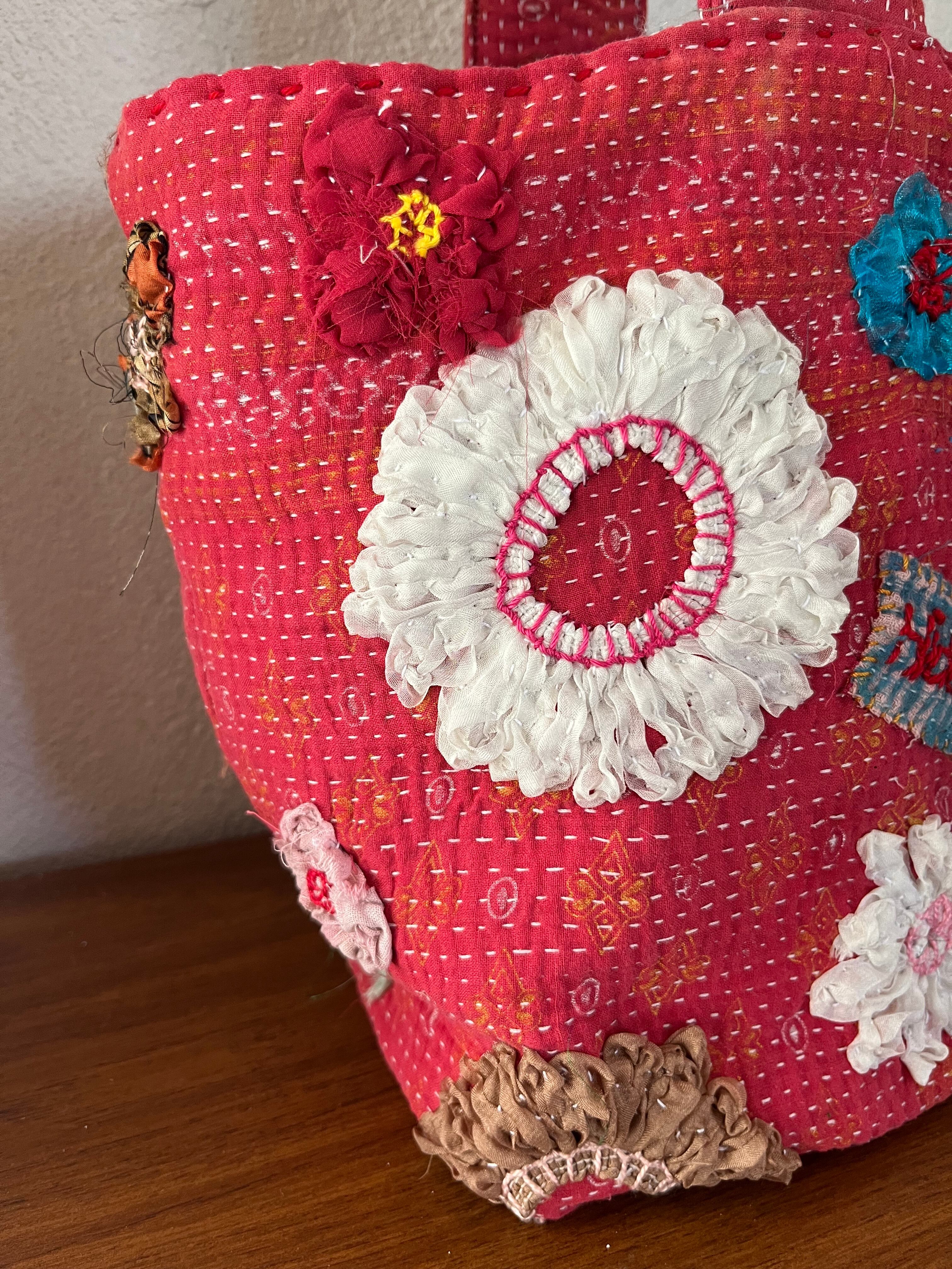 レースリボンやハギレをお花に見立てた華やかなバッグになります。