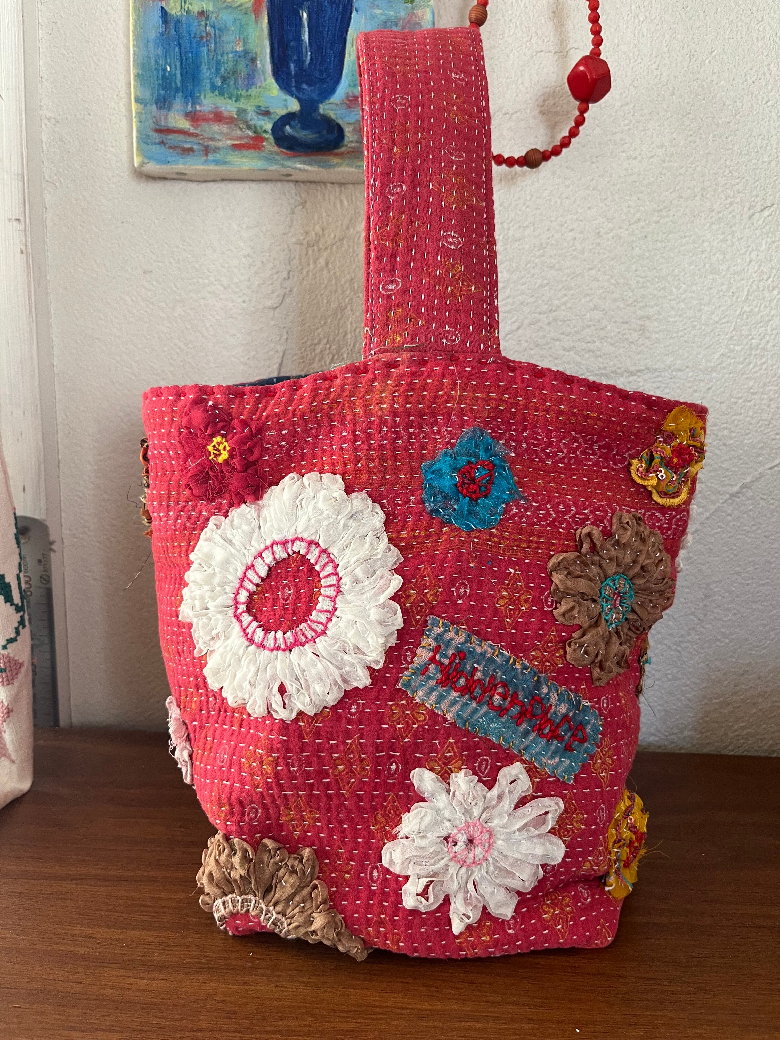 ヴィンテージカンタ生地を使ったワンハンドルのバケツ型のバッグ。